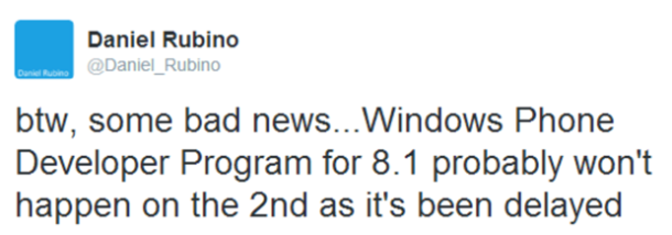 แต่มีข่าวร้ายครับ? Daniel Rubino นักเขียนและนักพัฒนาจาก WPCentral ได้ทวิตข้อความว่า Windows Phone 8.1 เวอร์ชั่น Developer Preview จะไม่มีการปล่อยให้คนที่ลงทะเบียนอัพเดตในวันเปิดตัวเลย จะล่าช้าไปอีกสักหน่อย แต่ไม่สามารถระบุวันเวลาได้ในตอนนี้