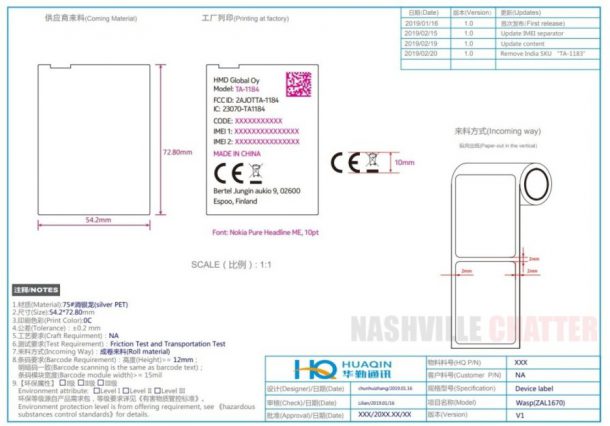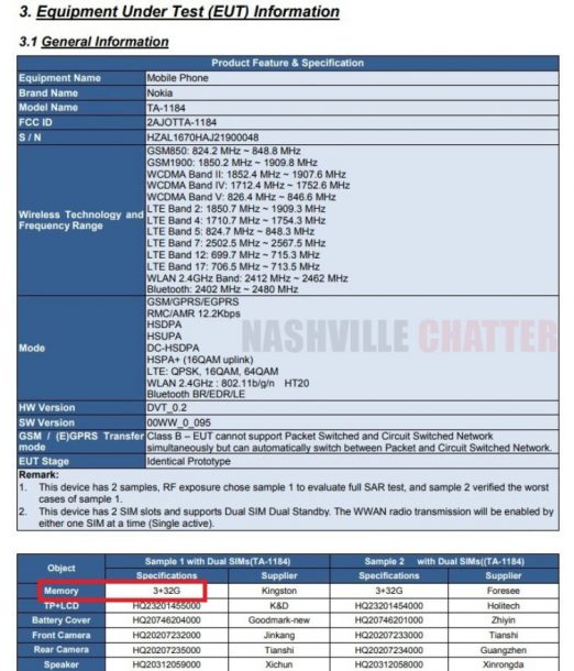 อุปกรณ์มีชื่อรหัสว่า Wasp (แมลงตัวต่อ) เอกสารเปิดเผยว่ามีแรมขนาด 3GB, ความจุ 32GB และรูเสียบหูฟัง 3.5 ม.ม. Nokia TA-1184 รองรับ dual SIM, 2.4GHz Wi-Fi, และรองรับ LTE LTE 2, 4, 5, 7, 12 และ 17 โทรศัพท์มีความยาว 145.96 มม. กว้าง 70.56 มม. และ วัดได้ในแนวทแยงมุม 154.83 มม. มาพร้อมหน้าจอขนาด 6.1 นิ้ว แต่ยังไม่แน่ชัดว่าจะมาพร้อมรอยบากแบบไหน