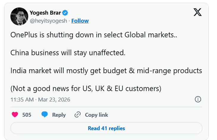 อย่างไรก็ตาม สิ่งที่น่ากังวลกว่าคือข่าวลือว่า OnePlus อาจเตรียมถอนตัวจากบางประเทศ โดยแหล่งข่าวระบุว่าแบรนด์จะหยุดดำเนินการในตลาดอย่าง สหรัฐ, ยุโรป และสหราชอาณาจักร