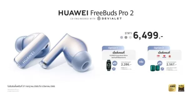 HUAWEI FreeBuds Pro 2 มีให้เลือก 3 สี 3 สไตล์ คือสีฟ้า Silver Blue, สีเงิน Silver Frost และสีขาว Ceramic White สามารถจับจองเป็นเจ้าของก่อนใครได้แล้ววันนี้ที่ราคาเพียง 6,499 บาท พร้อมโปรโมชันสุดคุ้มเฉพาะในช่วงพรีออเดอร์ ระหว่างวันที่ 27 กรกฎาคม 2565 ถึง 5 สิงหาคม 2565