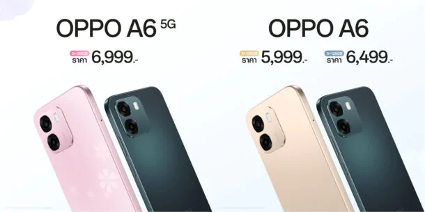 - OPPO A6 5G (6+128GB) มาใน 2 สี ได้แก่ สีชมพู Sakura Pink และสีน้ำเงิน Sapphire Blue วางจำหน่ายในราคา 6,999 บาท