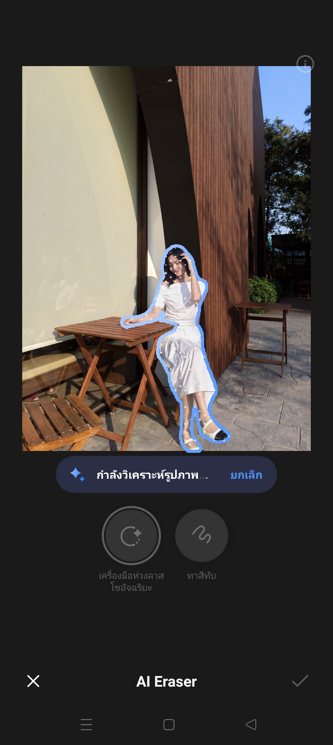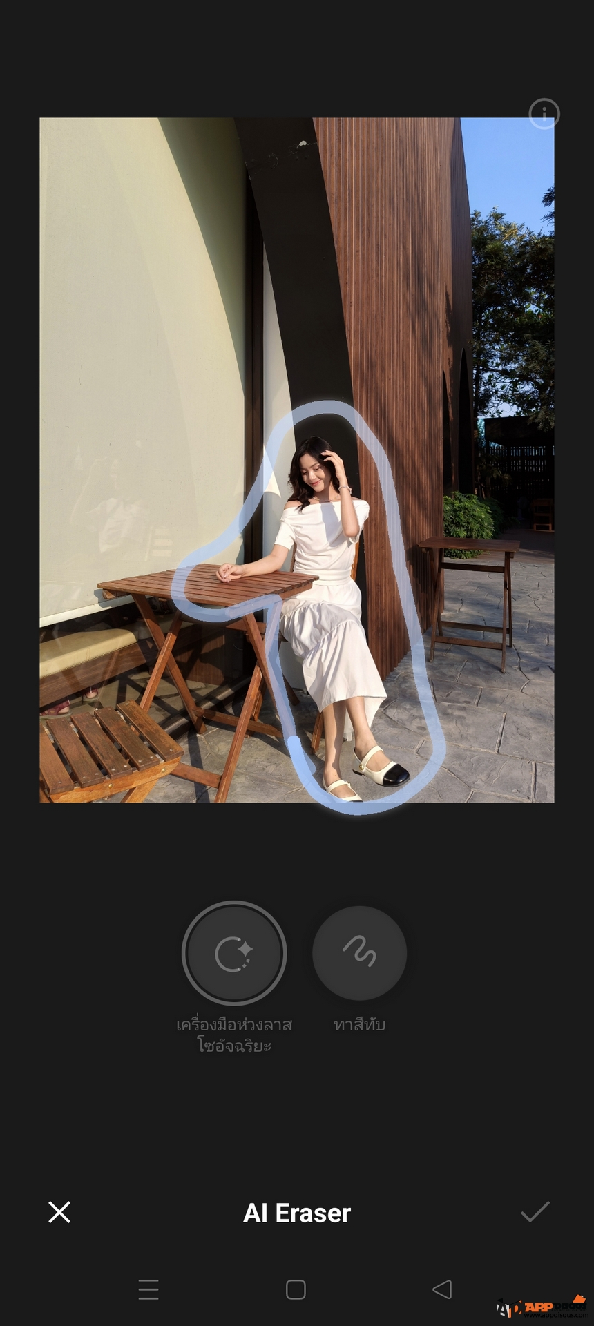 AI Eraser จะทำงานง่ายๆ แค่เพียงใช้ปลายนิ้ววงหรือวาดลงไปยังวัตถุที่เราไม่ต้องการบนภาพ ระบบจะจัดการลบและเสริมฉากพื้นหลังที่เข้ากันลงบนภาพให้อัตโนมัติ
