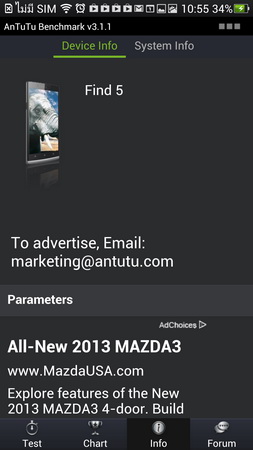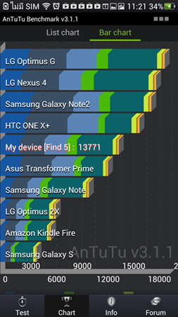 จากนั้นวัดคะแนนด้วย AnTuTu Benchmark OPPO Find 5 สามารถทำได้ที่ 13771 คะแนนซึ่งคะแนนระดับนี้ถือว่าอยู่ลำดับต้นๆ ของสมารท์โฟนที่มีวางขายในปัจจุปัน