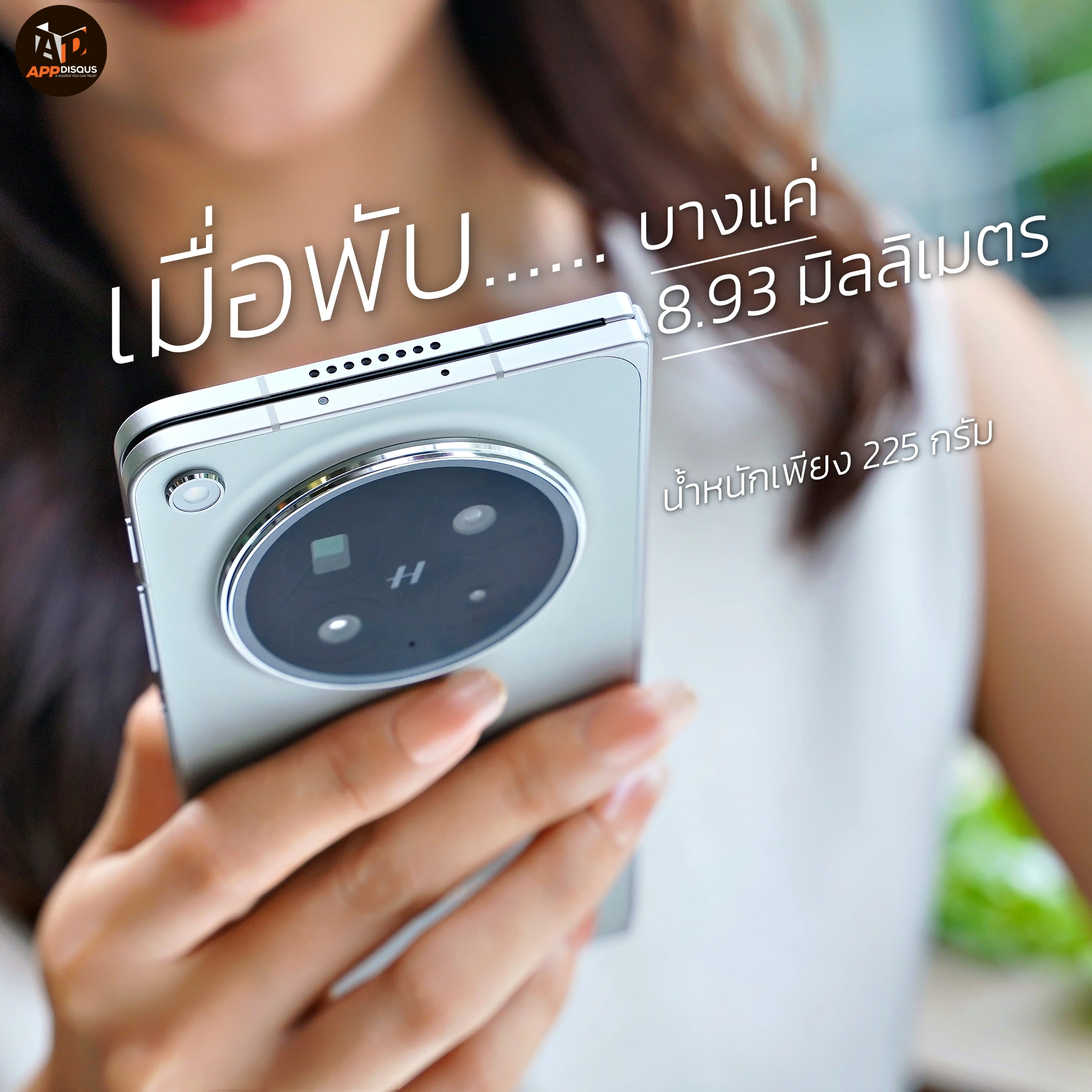 ตัวเครื่องมีความบางเพียง 8.93 มิลลิเมตร (เมื่อพับ) และน้ำหนักประมาณ 225 กรัม ซึ่งถือว่าอยู่ในระดับเดียวกับสมาร์ตโฟนเรือธงทั่วไป ทำให้การถือใช้งานขณะพับให้ฟีลที่คุ้นเคย และใช้งานมือเดียวได้สะดวก