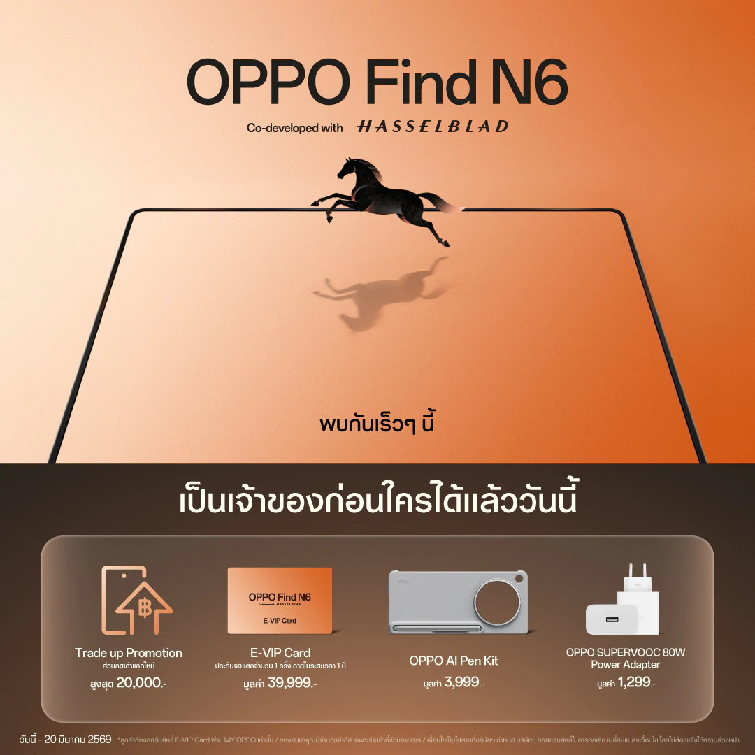 สำหรับผู้ที่สนใจ OPPO Find N6 ทาง OPPO ได้เปิดให้จอง ก่อนถึงวันที่ 20 มีนาคม 2569 พร้อมของสมนาคุณรวมมูลค่าสูงสุด 39,999 บาท เช่น