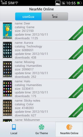 1. เชื่อมต่ออินเตอร์เน็ตแล้วเลือก Theme ที่ต้องการดาวน์โหลดใน Go Theme หรือ nearMe Online