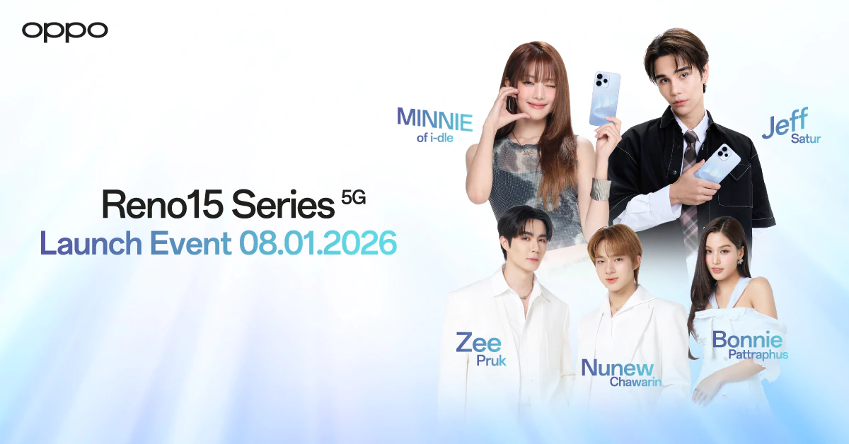 OPPO เตรียมสร้างโมเมนต์ใหม่ต้อนรับปี 2026 กับงานเปิดตัวอย่างเป็นทางการของสมาร์ตโฟนรุ่นล่าสุด OPPO Reno15 Series 5G สมาร์ตโฟนเพื่อนซี้ เทรนดี้ทุกช็อต ครบจบในเครื่องเดียว ที่พร้อมเป็นเพื่อนคู่ใจให้ทุกโมเมนต์โดดเด่นยิ่งขึ้น ผ่านเทคโนโลยีล้ำสมัยผสานกับดีไซน์สุดเทรนดี้ พร้อมยกระดับทุกการถ่ายภาพและวิดีโอให้โดดเด่นในทุกช็อต พร้อมก้าวไปอีกขั้นด้วยการเปิดตัวพร้อมกับ OPPO Watch S และ OPPO Pad 5 อุปกรณ์อัจฉริยะรุ่นใหม่ล่าสุดที่จะเชื่อมต่อไลฟ์สไตล์สุดสมาร์ตให้สมบูรณ์แบบยิ่งขึ้น ในวันที่ 8 มกราคมนี้