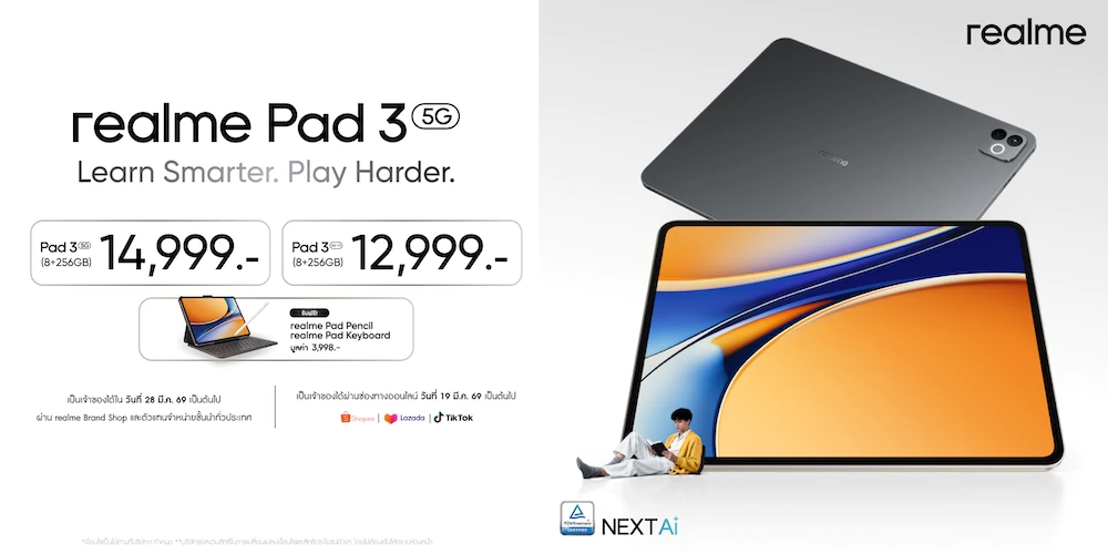 realme Pad 3 5G ความจุ 8/256GB ราคาเริ่มต้น 12,999 บาท (ในรุ่น Wifi) และราคา 14,999 บาท (สำหรับรุ่นที่สามารถใส่ซิมการ์