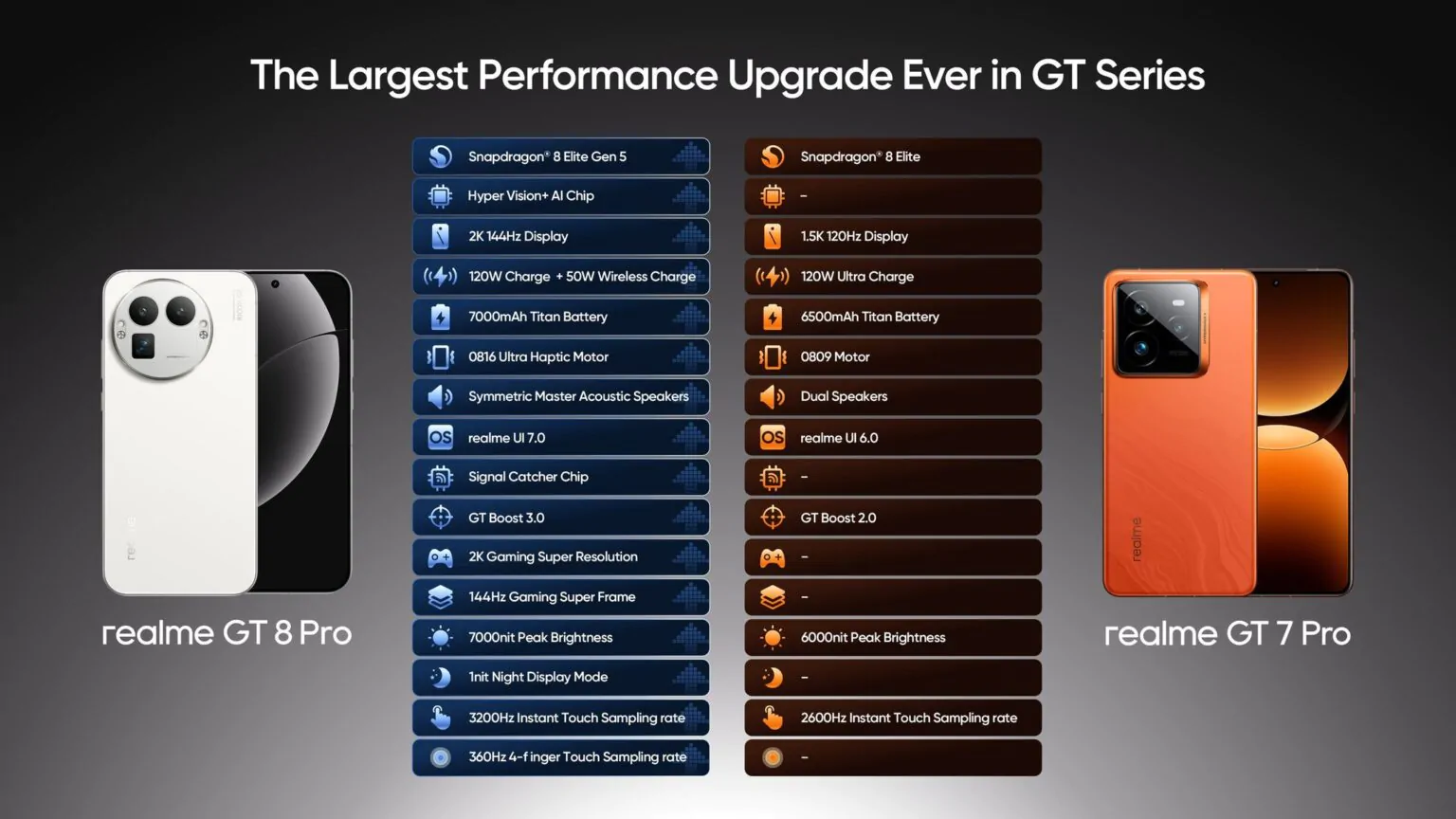 ก่อนการเปิดตัว realme ได้เผยภาพเปรียบเทียบอย่างเป็นทางการระหว่าง GT 8 Pro กับ GT 7 Pro ซึ่งแสดงให้เห็นถึงการอัปเกรดครั้งใหญ่ถึง 14 จุด โดยมีรายละเอียดสำคัญดังนี้: