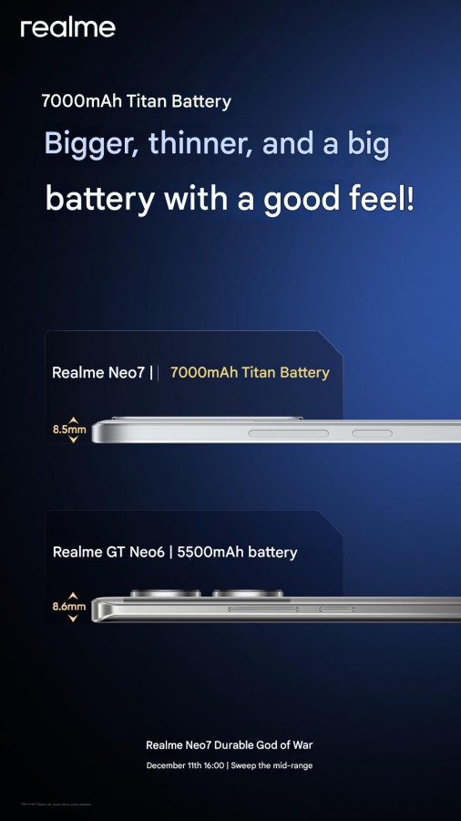 แม้ว่า realme Neo7 จะมีแบตเตอรี่ขนาดใหญ่ถึง 7,000 mAh แต่ตัวเครื่องจะบางกว่า realme Neo6 ถึง 0.1 มม. ต้องชมเชย realme ที่ทำให้เครื่่องบางได้แม้ว่าจะมีแบตเตอรี่ที่ใหญ่ขึ้น