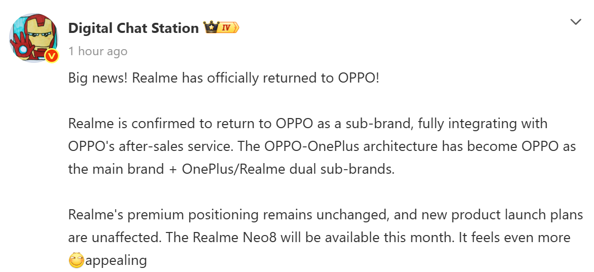 ด้านแหล่งข่าวอย่าง Digital Chat Station ระบุว่า โครงสร้างใหม่ของกลุ่ม OPPO จะประกอบด้วย OPPO แบรนด์หลัก และ OnePlus กับ realme ในฐานะซับแบรนด์คู่กัน พร้อมยืนยันว่า realme เตรียมเปิดตัว Realme Neo 8 ในจีนภายในเดือนนี้ตามกำหนดการ เช่นเดิม