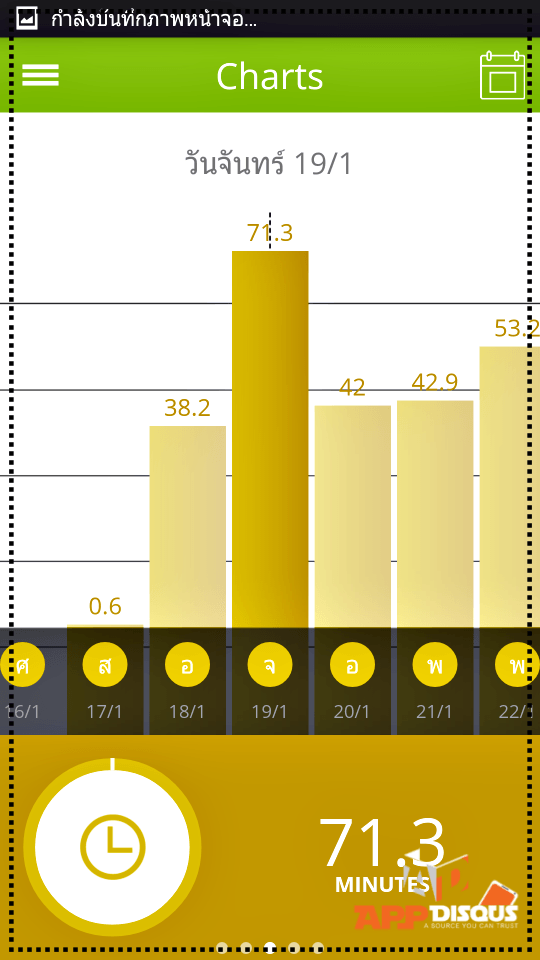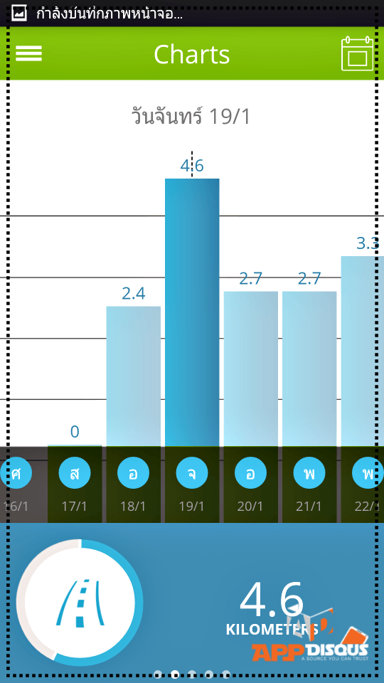และเมื่อเราสไลด์หน้าจอไปทางซ้าย ก็จะพบกับหน้าจอแสดงกิจกรรมการเคลื่อนไหวในแต่ละวันครับ จำนวนก้าว ระยะทาง ระยะเวลาในการเคลื่อนไหว และจำนวนแคลลอรี่ที่ใช้งานไปในวันนี้