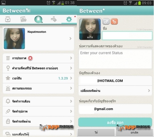 ในส่วนนี้เราก็จะสามารถตั้งชื่อที่ต้องการจะให้คู่ของเราเห็นได้ ใส่ข้อความ Status ของตนเองได้ เปลี่ยนรหัสผ่าน และลงชื่อออกจากแอพพลิเคชั่นได้จากหน้านี้เลยครับ เพื่อใครมีกิ๊กใช้งานหลายไอดี ก็สับรางกันเอาเองนะจ๊ะ ^^