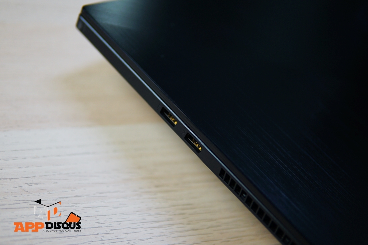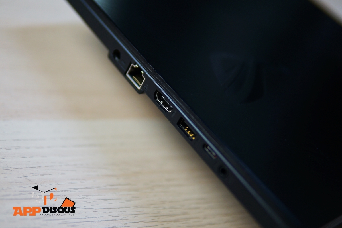 ฉะนั้นสีสันความเป็นเกมมิ่งของเครื่อง ASUS ROG Zephyrus GA502DU จะมีแค่พอประมาณ ใช้สีเข้ม เนื้อโลหะปัดลายเส้น มีการออกแบบที่ดูดุดันแต่ไม่ฉูดฉาด ตัวเครื่องไม่หนาซึ่งถือว่าบางเลยละครับสำหรับเครื่องเกมมิ่ง 19.9 มิลลิเมตร พอร์ทเชื่อมต่อมีครบพร้อม LAN ตัวคีย์บอร์ดมีการวางเลย์เอาท์เพื่อใช้ในงานพิมพ์ ไม่ได้เพิ่มความฉูดฉาดแบบสายเกมมิ่ง มีเพียงแค่มาร์คเล็กๆ บนปุ่ม “W” เอาไว้ให้ปลายนิ้วรับรู้เป็นพิเศษเล็กน้อยเท่านั้น