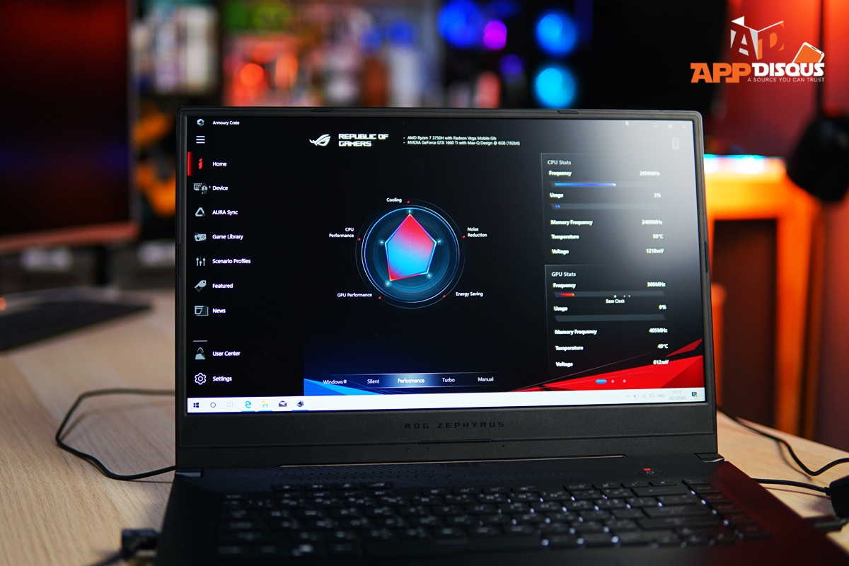 ความแรงระดับนี้สำหรับเรื่องแบตเตอรี่ เราสามารถเลือกได้จากโหมดการทำงาน 4 ระดับที่ ASUS ออกแบบมาให้เราเลือกใช้ โดยในโหมดการใช้งานทั่วไป แบตเตอรี่ของ ROG Zephyrus GA502DU อยู่กับเราได้ประมาณ 6 ชั่วโมงนิดๆ นะครับ แต่ถ้าเอามาเล่นเกมขณะใช้พลังงานจากแบตก็จะสามารถหมดภายใน 3 ชั่วโมงได้เหมือนกันครับ ฉะนั้นถ้าจะเล่นเกมแนะนำหาปลั๊กเสียบไฟด่วน และจะสามารถเปิดโหมดการทำงาน “Turbo” ซึ่งเป็นระบบ ROG Boost ที่ใช้การเร่งไฟให้การ์ดจอ GTX 1660 Ti ให้ไปสุดถึง 1435 MHz ที่ไฟระดับ 60 W ซึ่งเป็นระดับการทำงานสูงสุดของเครื่องได้ด้วย