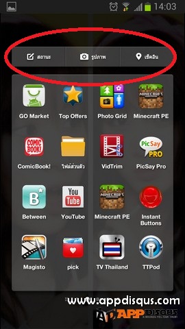 ในหน้าการเรียกใช้งานแอพพลิเคชั่น เราจะสังเกตเห็นว่า ด้านบนของหน้าเรียกใช้ด่วน จะมีแถบเครื่องมือการโพสของ facebook ฝังเอามาไว้ให้อีกด้วยครับ เราสามารถกดเข้าไปโพสข้อความ แชร์ภาพถ่าย หรือเช็คอินสถานที่ได้จากที่หน้านี่เลยครับ กดแล้วมันก็จะพาเราเข้าไปทำงานในแอพ facebook ของเราโดยทันที