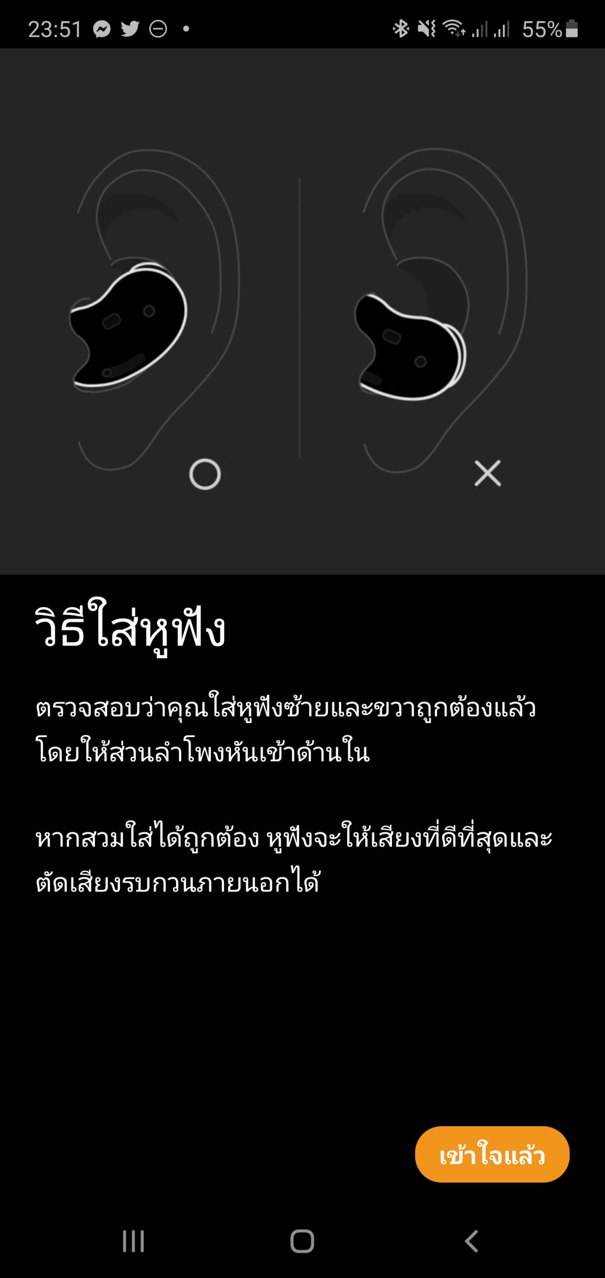 ตัวหูฟังเอียบัดจะไม่ทำงานหากไม่อยู่ในตำแหน่งที่ถูกต้อง ถ้าใส่แล้วยังรู้สึกว่าไม่พอดีให้เปลี่ยนยางส่วนปีกอีกไซส์ที่แถมมาให้ในกล่องค่ะ