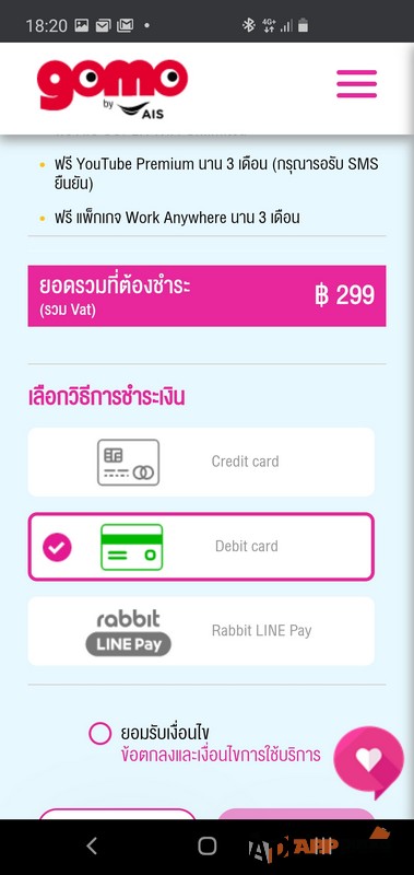 เมื่อกรอกข้อมูลครบถ้วน ก็มาถึงขั้นตอนการจ่ายเงิน ขั้นตอนนี้มีให้เลือกวิธีการจ่ายเงินหลายรูปแบบ จะจ่ายผ่านบริการ Rabbit LINE Pay ก็ได้ จะจ่ายผ่านทางบัตรเครดิตหรือบัตรเดรบิตก็สามารถทำได้เช่นเดียวกัน เลือกรูปแบบการจ่ายเงินตามความสะดวกกันได้เลยครับ โดยระบบจะทำการตัดเงินสำหรับการใช้บริการอัตโนมัติทุกๆ เดือนครับ จากนั้นรอรับซิมที่บ้านได้เลย