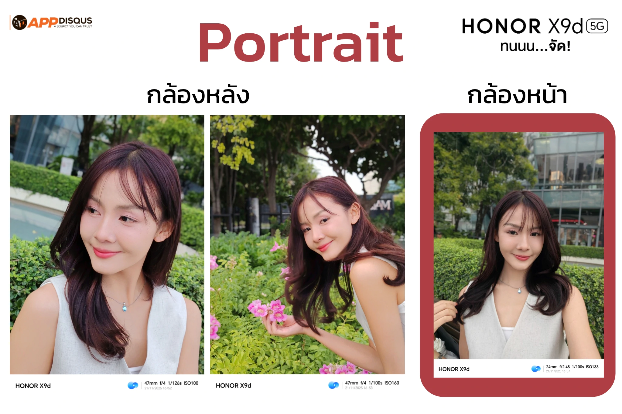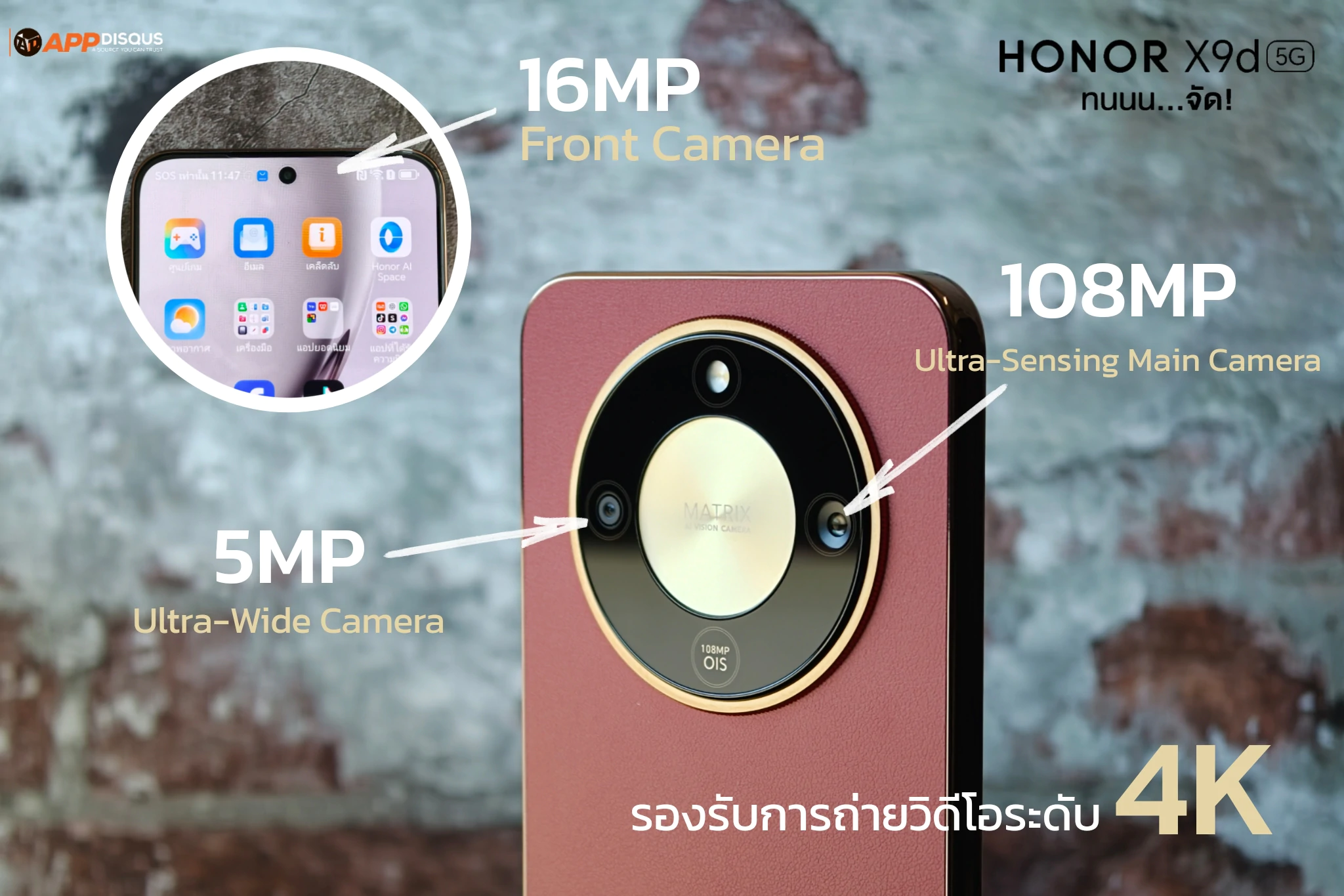 กล้องหลังของ HONOR X9d ใช้เซนเซอร์ 108MP (1/1.67”) รูรับแสง f/1.75 พร้อมระบบกันสั่นคู่ OIS + EIS ทำให้ภาพนิ่งขึ้นเมื่อถ่ายในที่แสงน้อย หรือถ่ายวิดีโอแบบเดินถือ