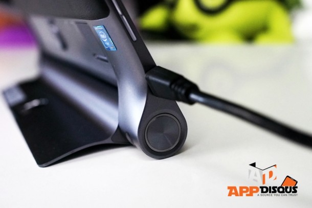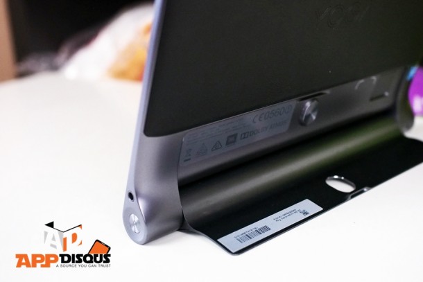 ด้วยขาตั้งที่พับเก็บได้ด้านหลัง มันทำให้ Yoga Tab 3 Pro สามารถวางการทำงานของมันได้หลายรูปแบบ รวมทั้งเป็นที่แขวนฝาผนังได้ด้วย ตรงจุดนี้ทำออกมาได้แข็งแรงน่าใช้ครับ เนื่อวัสดุเป็นโลหะทั้งชิ้น มีปุ่มล็อกแน่นหนา