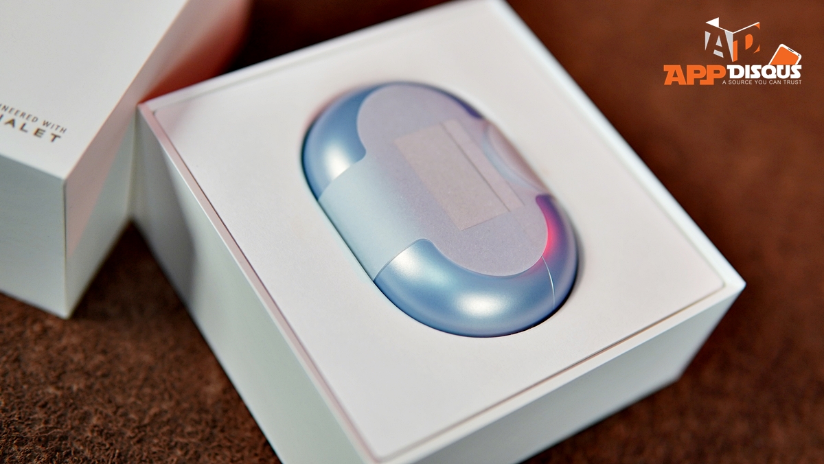ตัวหูฟังที่ทาง Appdisqus ได้มารีวิว จะเป็นสี Silver Blue สีฟ้าเมทัลลิกด้านผิวมุขสีน่ารักทีเดียวค่ะ เหมาะมากสำหรับใครที่เบื่อหูฟังสีขาวสีดำ ความเมทัลลิกช่วยเพิ่มความหรูให้กับตัวหูฟังและตัวเคส ด้วยความที่ตัวเคสเป็นสีด้านทำให้ไม่เป็นรอยนิ้มมือง่าย จะมีก็ตรงส่วนที่บานพับเคสด้านหลังสกรีนโลโก้ Huawei จะเป็นส่วนที่เป็นรอยนิ้วมือง่าย