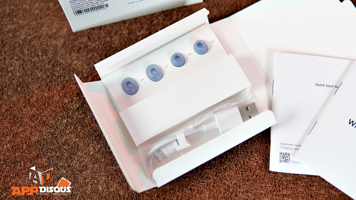ด้านล่างจะเป็นไฟบอกสถานะ และพอร์ตชาร์จ USB Type C ด้านข้างของตัวเคสจะเป็นปุ่มรีเซ็ตหูฟัง น้ำหนักของตัวเคสไม่รวมหูฟังอยู่ที่ประมาณ 52.1 กรัม ขนาดกระทัดรัดพกพาง่าย ตัวหูฟังสวยค่ะ ให้ความรู้สึกหรูและดูแพง ตัวหูฟังสีเงินอมฟ้า ที่ทางหัวเว่ยบอกว่าออกแบบตามสรีระศาสตร์เพื่อความกระชับ แต่ขนาดหูของแต่ละคนมันไม่เท่ากันอยู่แล้ว ส่วนตัวคิดว่ามันค่อนข้างจะใหญ่ไปสักหน่อย แต่พอใส่แล้วรู้สึกว่ามันกระชับเข้ากับช่องหูพอดี