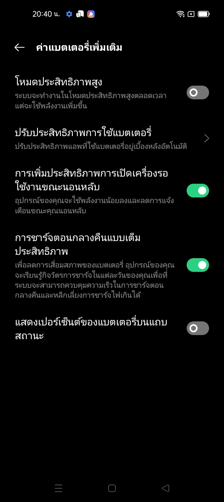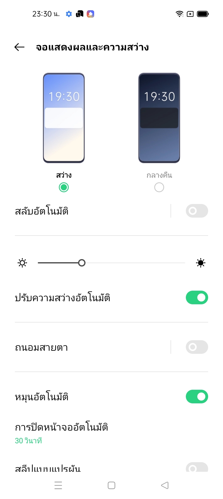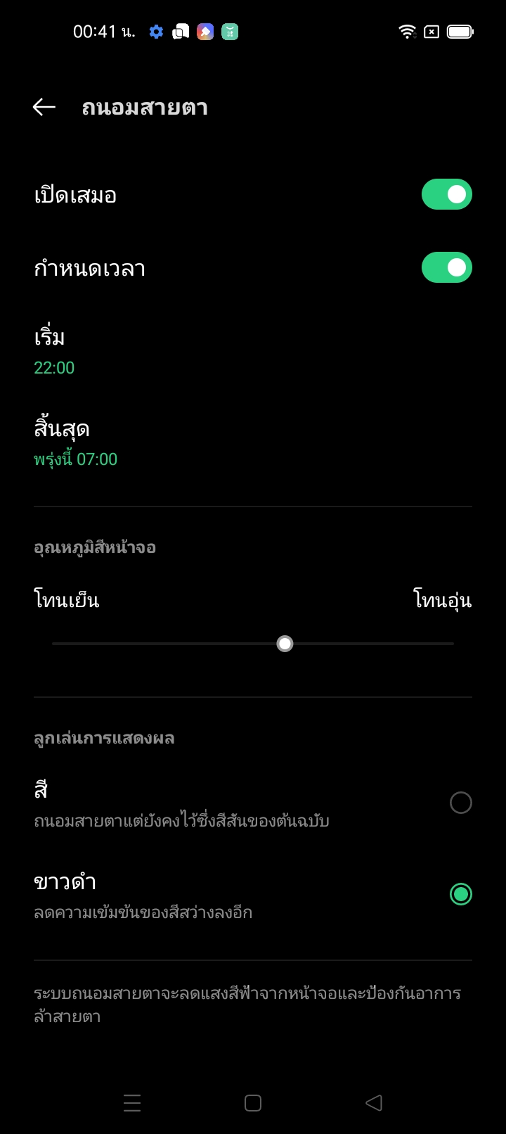เวลาใช้งานกลางคืน เราสามารถตั้งหน้าจอให้เปลี่ยนใช้ธีมดำ หรือการลดแสงสีฟ้าในเวลากลางคืนไว้ได้ล่วงหน้าครับ ให้เปิดปิดการทำงานเองในแต่ละวันตามเวลา มีทั้งโหมดสีดำ โหมดปรับลดแสงสีฟ้าของหน้าจอและป้องกันอาการเมื่อยล้าสายตา หรือจะเปลี่ยนการแสดงผลให้กลายเป็นโทนขาวดำเลยก็ได้ครับ เพื่อใช้อ่านหนังสือกันแบบจริงจัง