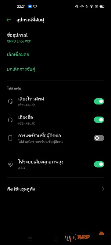 ฟังก์ชั่นการควบคุมผ่านการทัชทำออกมาใช้งานง่าย แต่ก็มีข้อที่ขาดไปสำหรับคนชอบปรับแต่ง เพราะหูฟัง OPPO Enco W31 ถูกออกแบบโดยเน้นการใช้งานได้ในทันทีและเชื่อมต่อโดยอัตโนมัติ โดยเฉพาะเมื่อใช้กับสมาร์ทโฟน OPPO จะมีการปรับแต่งพิเศษและสามารถเปิดโหมดเสียง AAC ได้ด้วยครับ