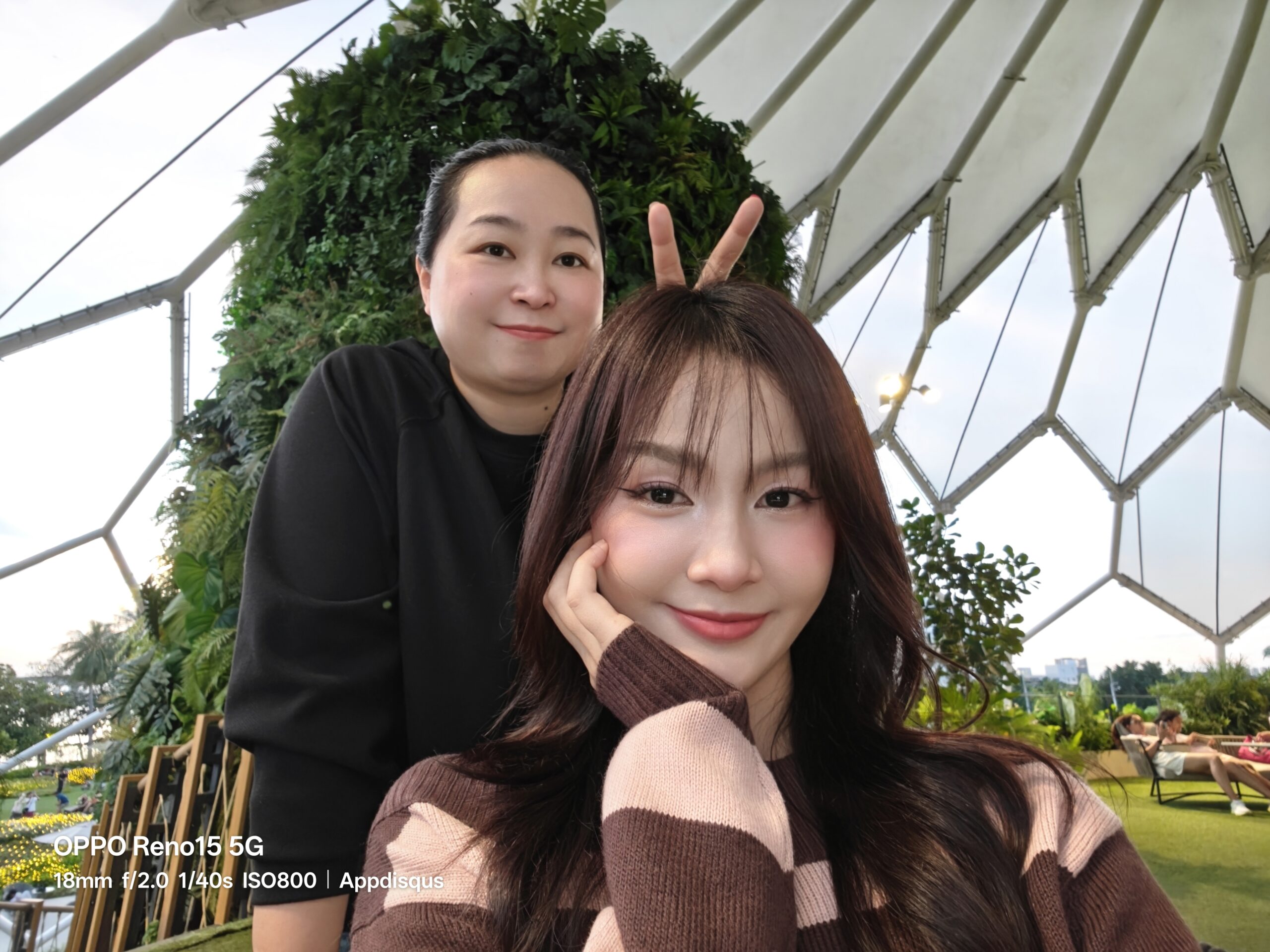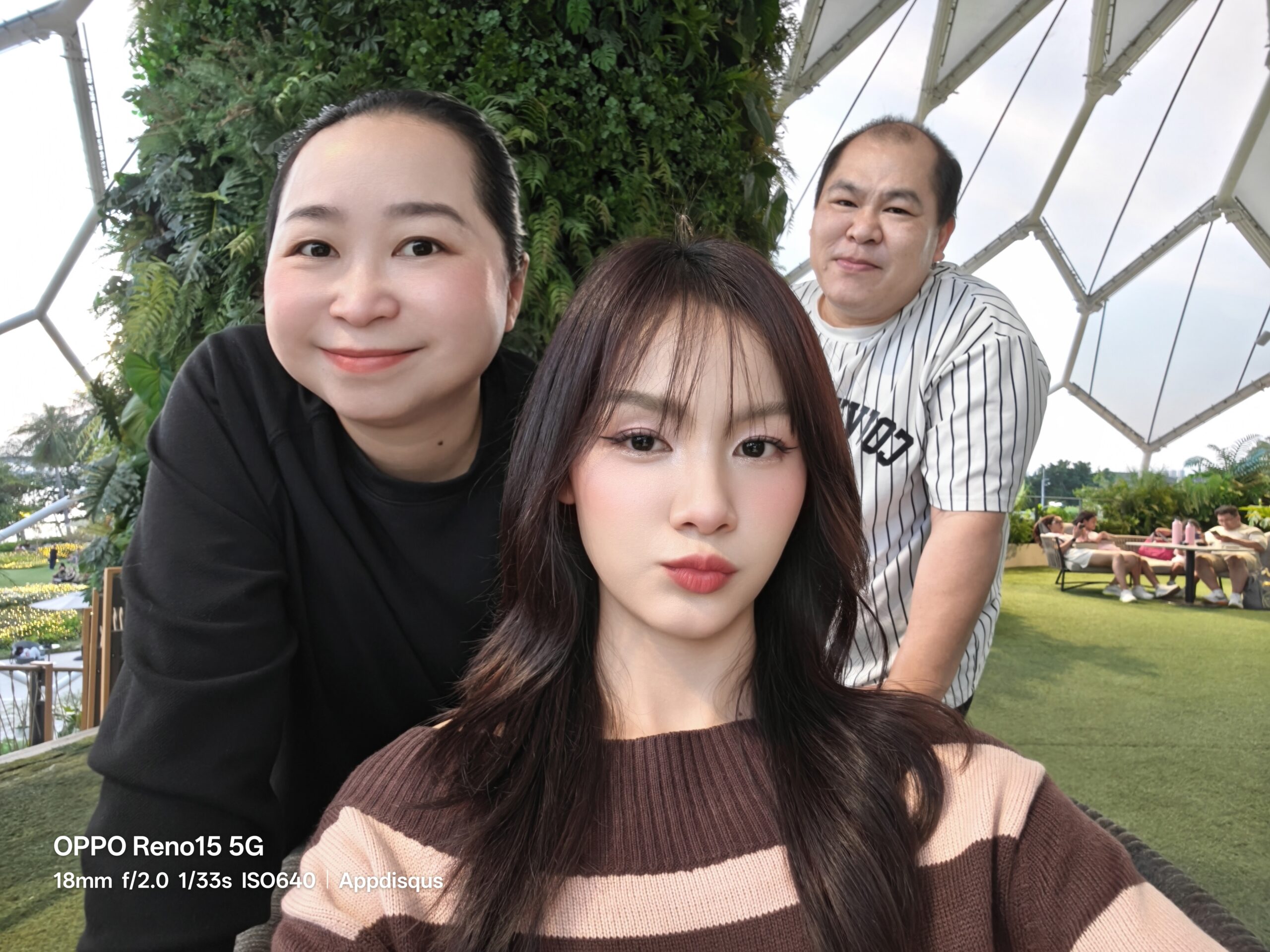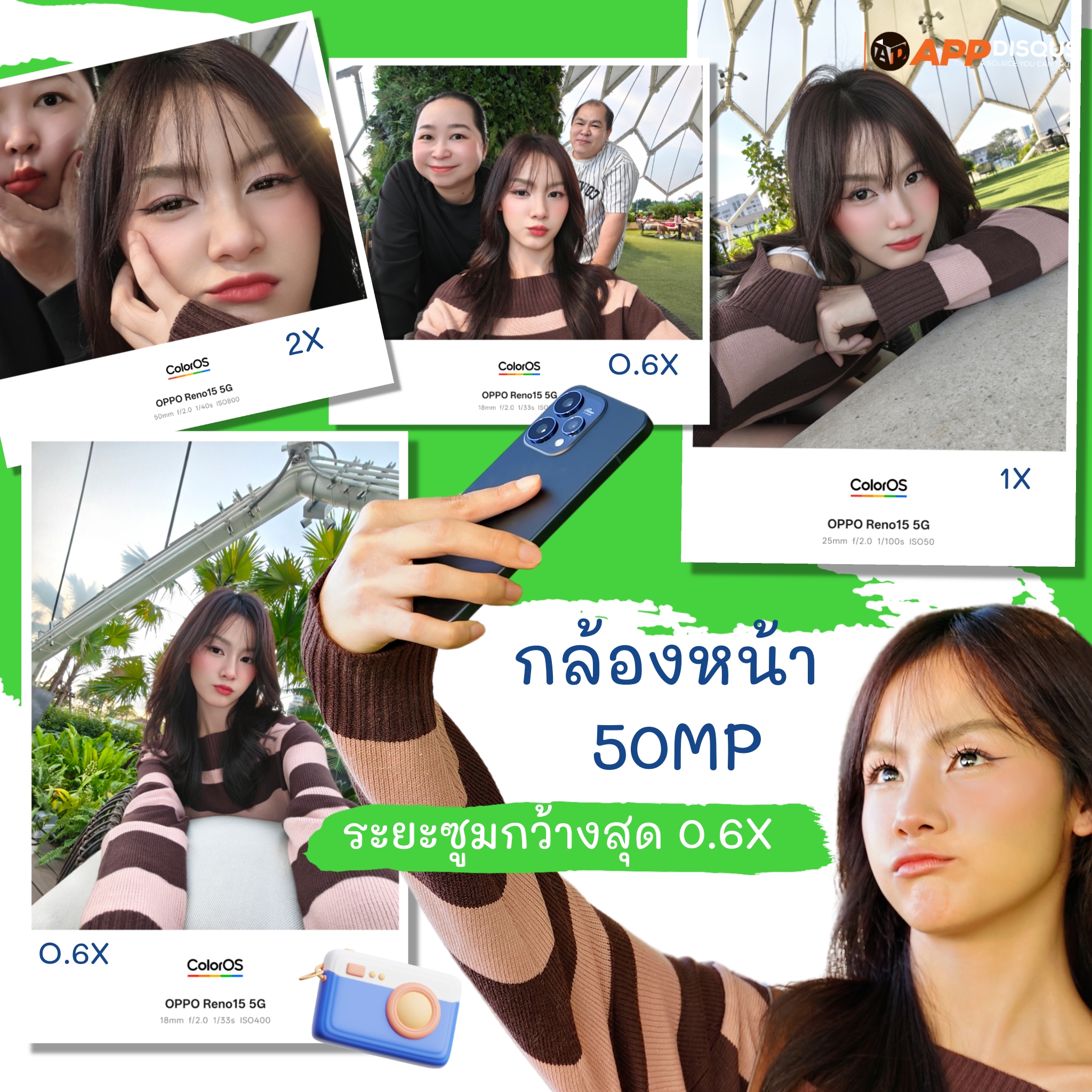 กล้องหน้าของ OPPO Reno 15 5G ซึ่งเป็นหนึ่งในจุดเด่นของรุ่นนี้ ใช้กล้องเซลฟี่ความละเอียด 50MP รูรับแสง f/2.0 โดยรองรับการถ่ายภาพมุมกว้างพิเศษด้วยระยะใหม่ 0.6x ที่กว้างที่สุดในอุตสาหกรรม ช่วยให้การถ่ายเซลฟี่กลุ่มหรือการถือกล้องถ่ายเองก็สามารถเก็บคนและฉากรอบตัวได้ “กว้างมากกว่าเดิม”