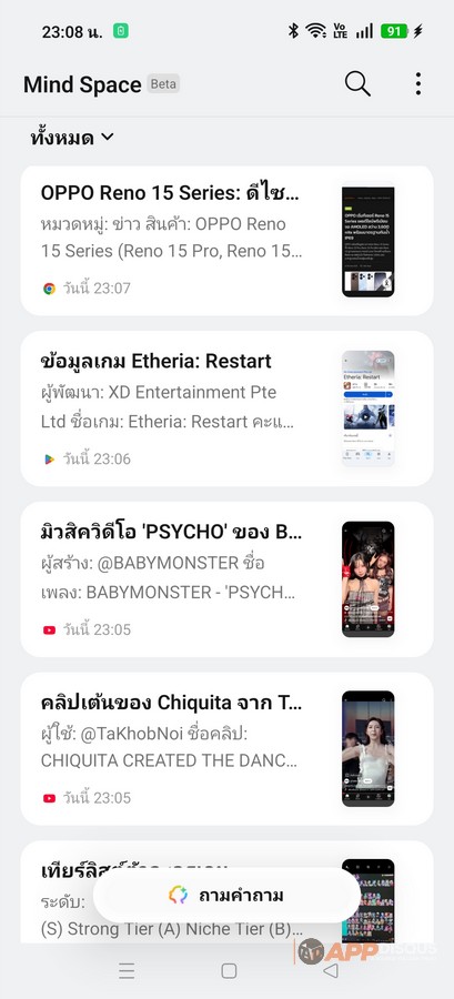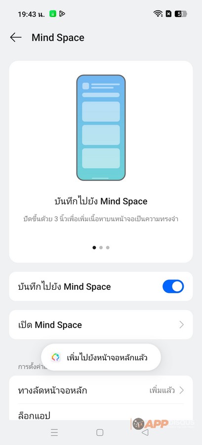 เราสามารถใช้สามนิ้วสไลด์ขึ้นบนหน้าจอ เพื่อให้ AI Mind Space จัดเก็บสิ่งที่อยู่ตรงหน้าเข้าไปในระบบ ผู้ใช้สามารถดึงข้อมูลสำคัญกลับมาใช้งานได้รวดเร็ว โดยไม่ต้องคอยจำว่าเก็บไว้ในแอปไหน เหมาะกับไลฟ์สไตล์ที่มีข้อมูลจำนวนมากในแต่ละวัน ทั้งเรื่องงาน เรื่องส่วนตัว และคอนเทนต์ต่าง ๆ และสามารถจัดเก็บแยกประเภทให้เป็นระเบียบได้อย่างง่ายๆ