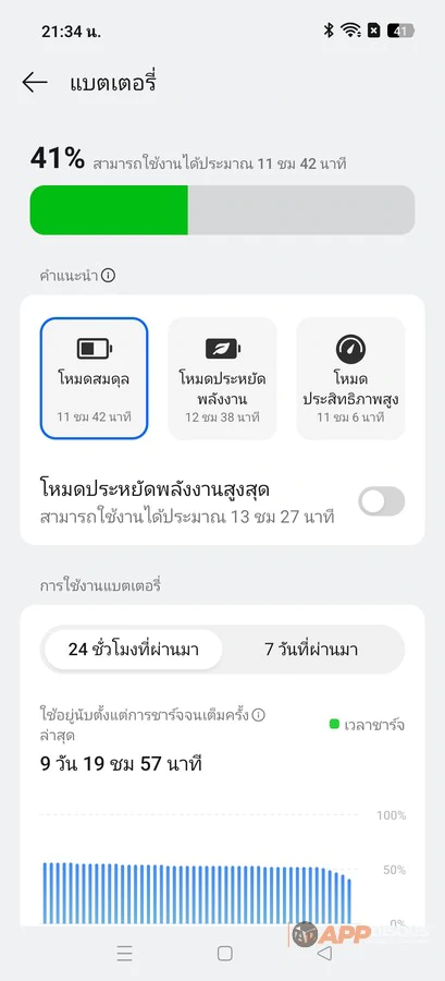 มีระบบจัดสรรพลังงานมาให้ปรับใช้เยอะมาก โหมดการทำงาน 3 ระดับ สมดุล, ประหยัดพลังงาน, หรือเร่งประสิทธิภาพสูง จะเปิดโหมดไหนก็อยู่ได้เต็มวัน