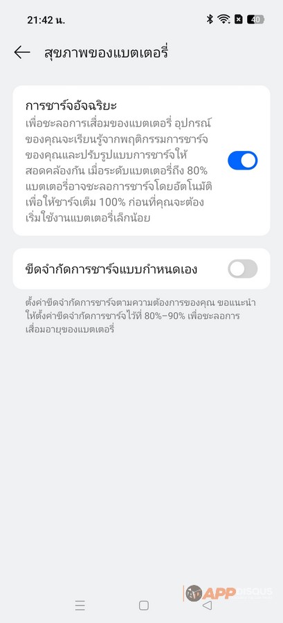 มีโหมดดูแลสุขภาพของแบตเตอรี่ ปรับระดับกำลังไฟและการเก็บประจุให้เหมาะสมระหว่างการใช้งานได้เอง เพื่อยืดอายุการใช้งานของแบตให้ยาวนาน โดยรุ่นนี้ทาง OPPO ได้ออกแบบให้ตัวแบตเตอรี่สามารถรักษาประสิทธิภาพการเก็บประจุไฟไว้ได้เกิน 80% แม้จะมีอายุการใช้งานไปครบ 5 ปีเลยทีเดียวนะครับ