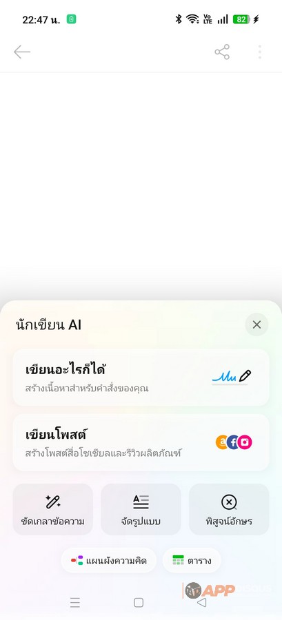 นักเขียน AI – ตัวนี้มีไว้สำหรับช่วยเขียน (พิมพ์) แก้คำสะกด ออกแบบข้อความ หรือช่วยเขียนขึ้นมาทั้งชุด แค่บอกสิ่งที่ต้องการเขียน ระบุแนวที่ต้องการ สไตล์คำที่อยากได้ เดี๋ยว AI เขียนให้ได้ทั้งหมด ไม่ต้องพิมพ์เอง