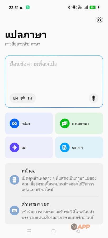 AI แปลภาษา – ความสามารถในการแปลภาษาที่รองรับสื่อแทบจะทุกรูปแบบ ทั้งจากเสียง จากภาพหน้าจอ จากรูปภาพ จากกล้องถ่ายภาพ หรือจากเอกสาร หรือแม้แต่การสนทนาสดแบบต่อหน้า ก็พร้อมจะแปลภาษาให้ได้ทั้งหมดทุกรูปแบบ ซึ่งเป็นระบบที่ทาง OPPO พัฒนาขึ้นมาเอง และรองรับการดาวน์โหลดชุดภาษาเพื่อใช้งานแบบออฟไลน์ได้ด้วยครับ