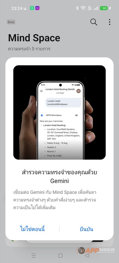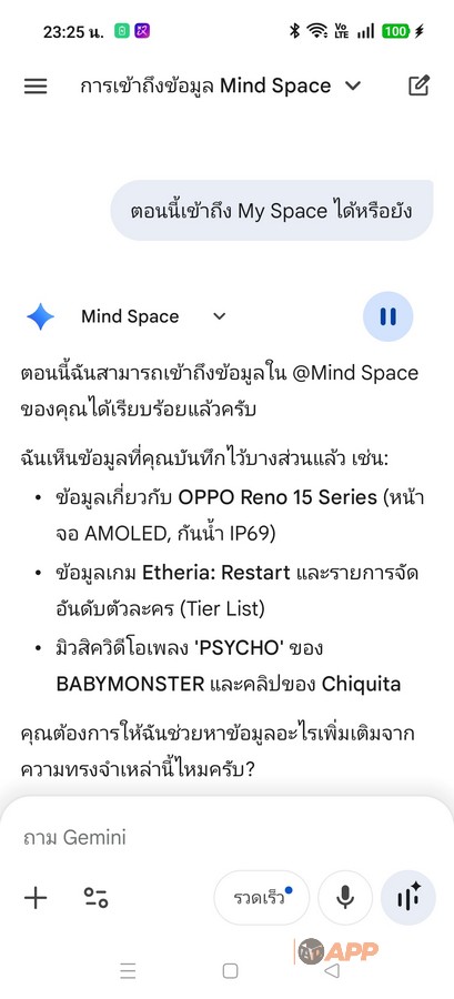 อีกจุดเด่นของ ColorOS 16 ใน OPPO Reno 15 5G คือการผสาน Google Gemini เข้าไปกับระบบในชั้นลึกเอาไว้แล้ว ทำให้ผู้ใช้สามารถสั่งงาน ค้นหาข้อมูล และจัดการงานต่าง ๆ ได้สะดวกขึ้นภายใน ColorOS โดยไม่ต้องสลับแอปไปมา