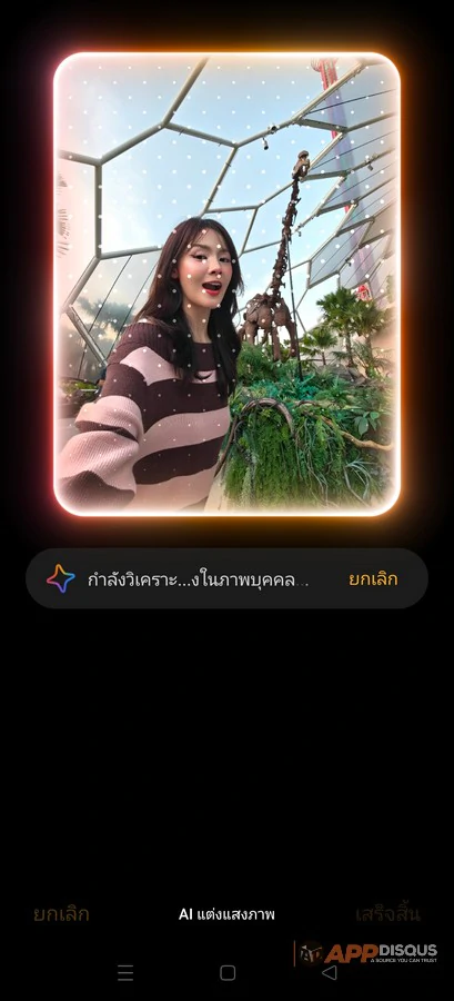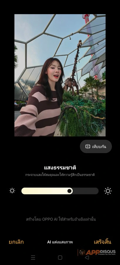 ในฟีเจอร์ด้าน AI ของ OPPO Reno 15 5G มาพร้อมฟีเจอร์ AI Portrait Glow ตัวนี้ฉลาดครับ มันช่วยปรับแสงและโทนผิวของตัวแบบในภาพให้ออกมาดูสว่าง มีออร่า เลือกระดับความสวยขาวได้ตามใจ แต่มันจะไม่ไปรบกวนฉากหลังหรือสภาพแวดล้อมให้ดูผิดธรรมชาติไปโดยเด็ดขาด
