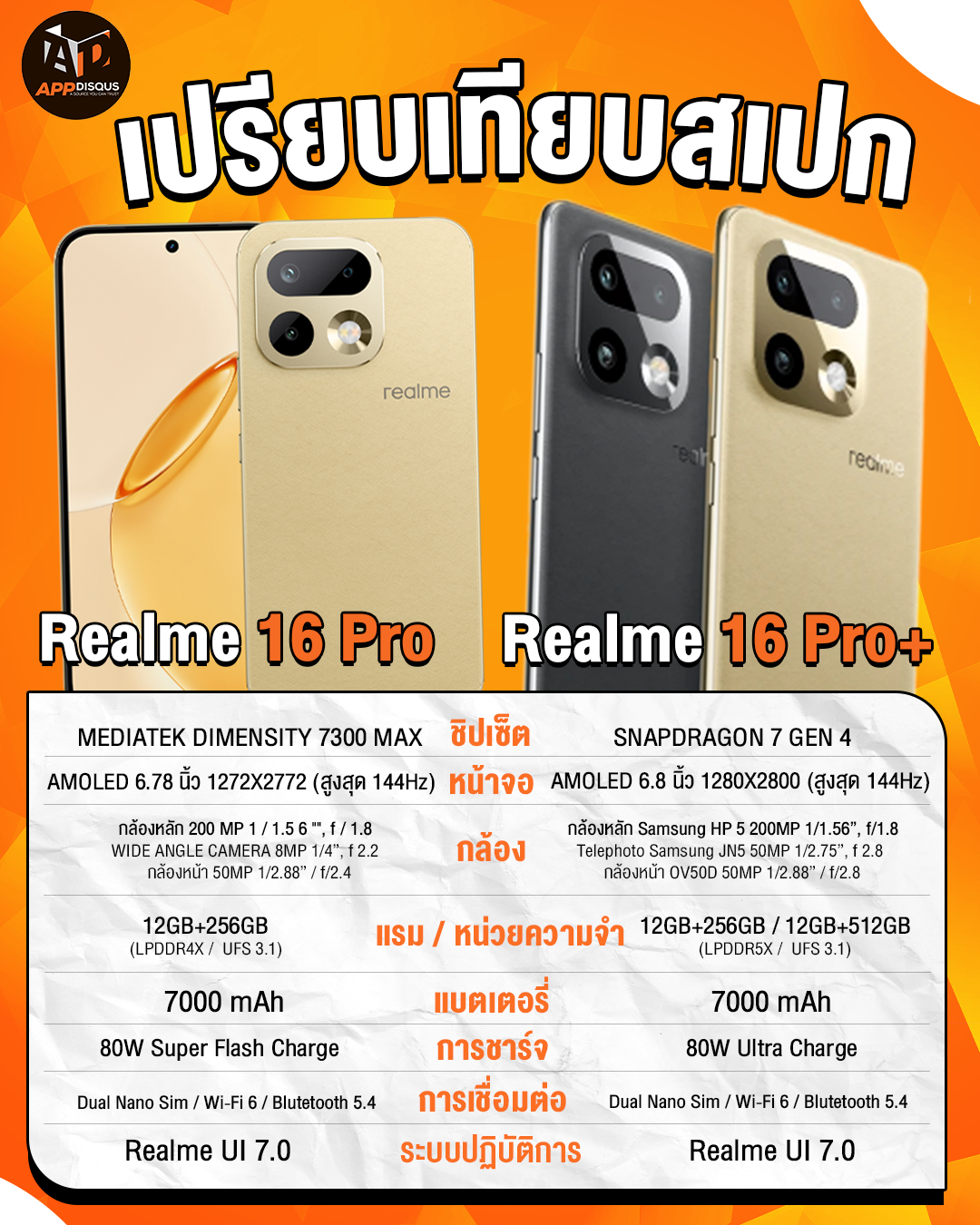 เปรียบเทียบสเปก realme 16 Pro 5G กับ realme 16 Pro+ 5G