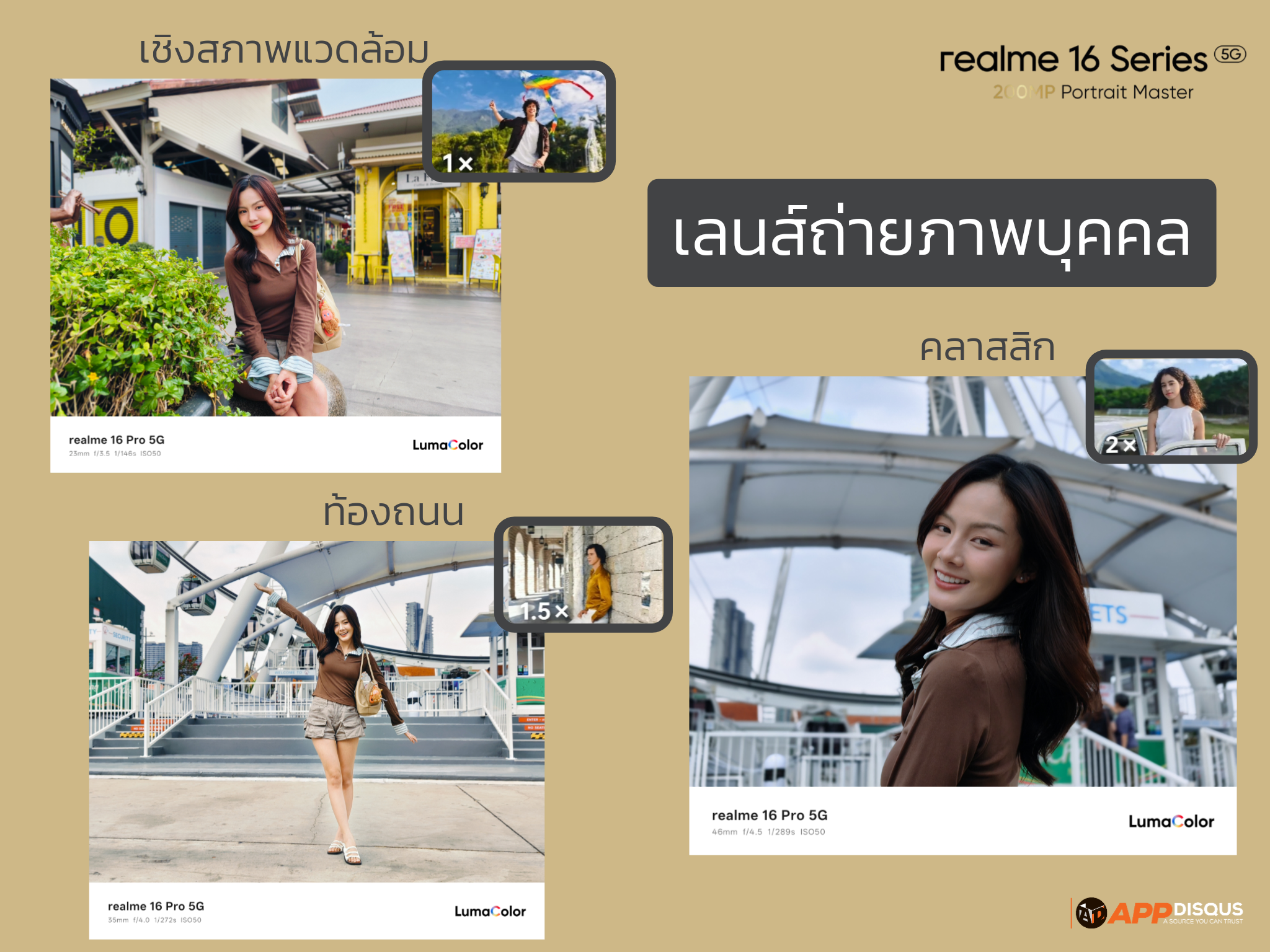realme 16 Pro Series สามารถถ่ายภาพ Portrait ในระยะเลนส์หลายช่วงมาก ได้แก่ 1×, 1.5×, 2×, 3.5× และ 4× ซึ่งช่วยให้การจัดองค์ประกอบภาพมีความยืดหยุ่นมากขึ้น