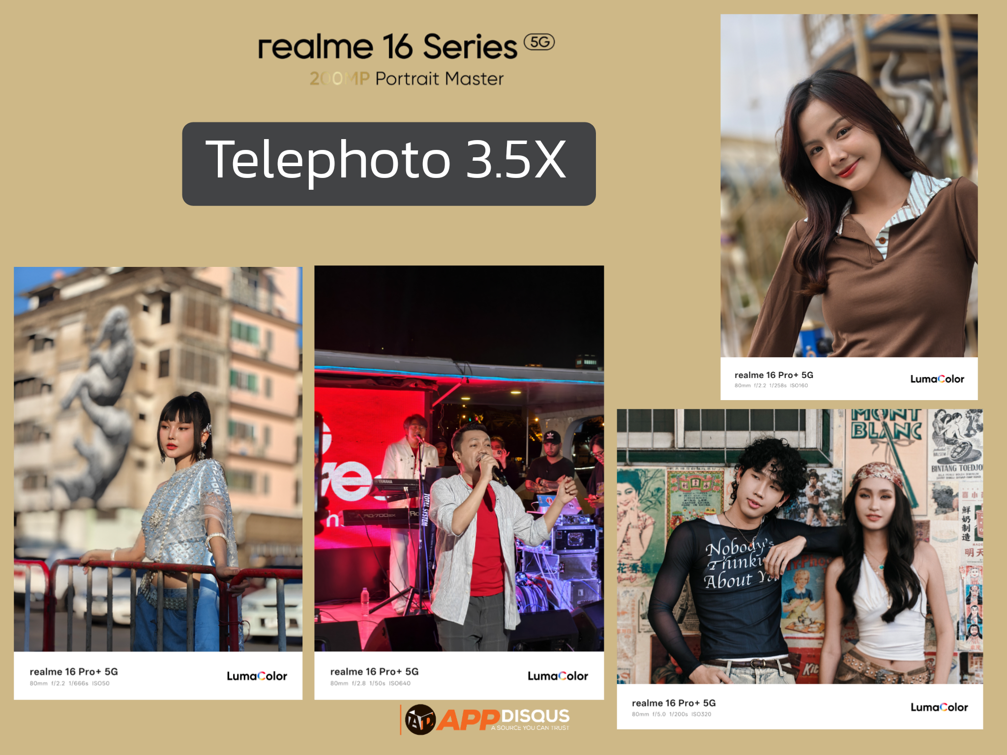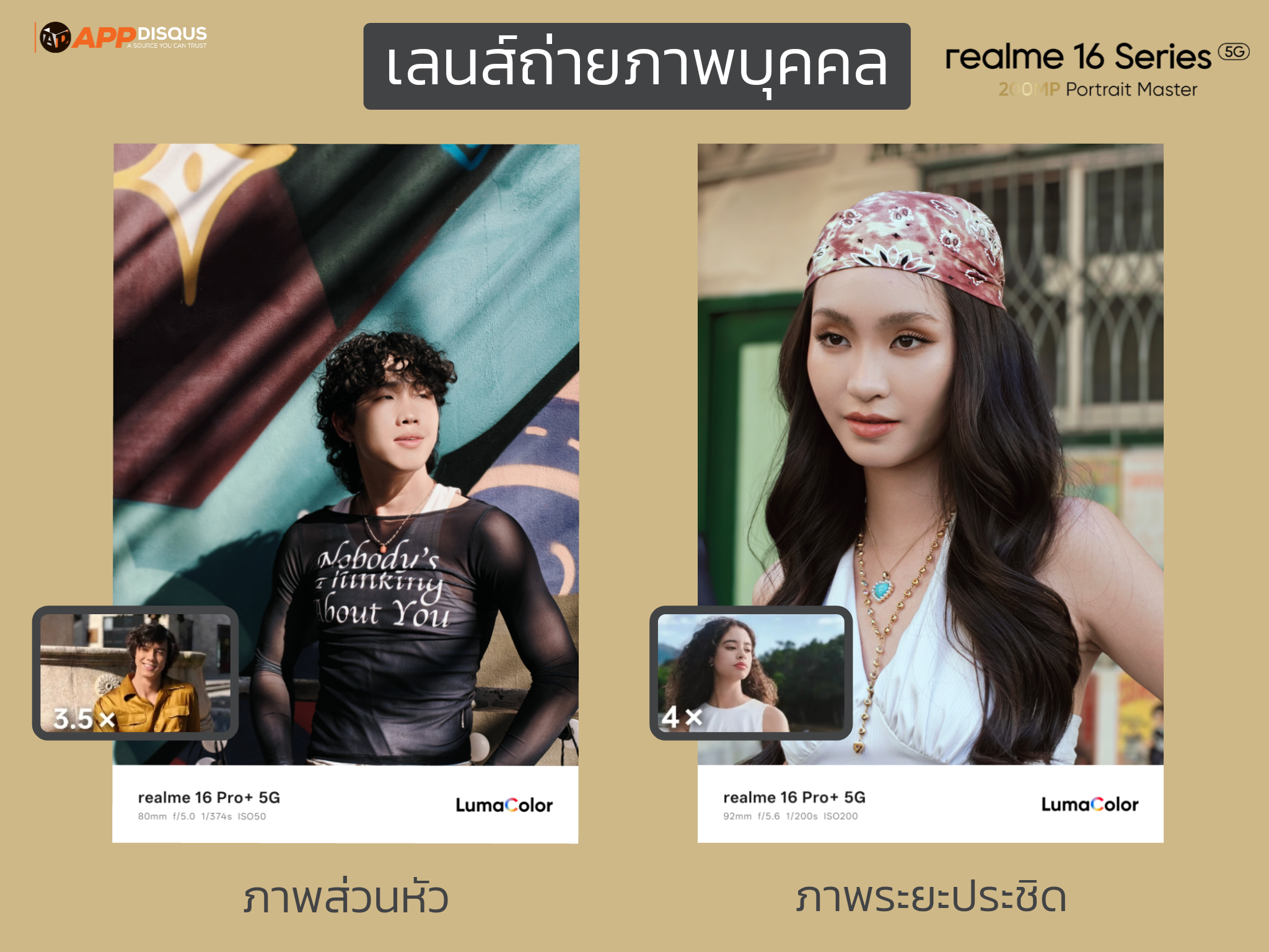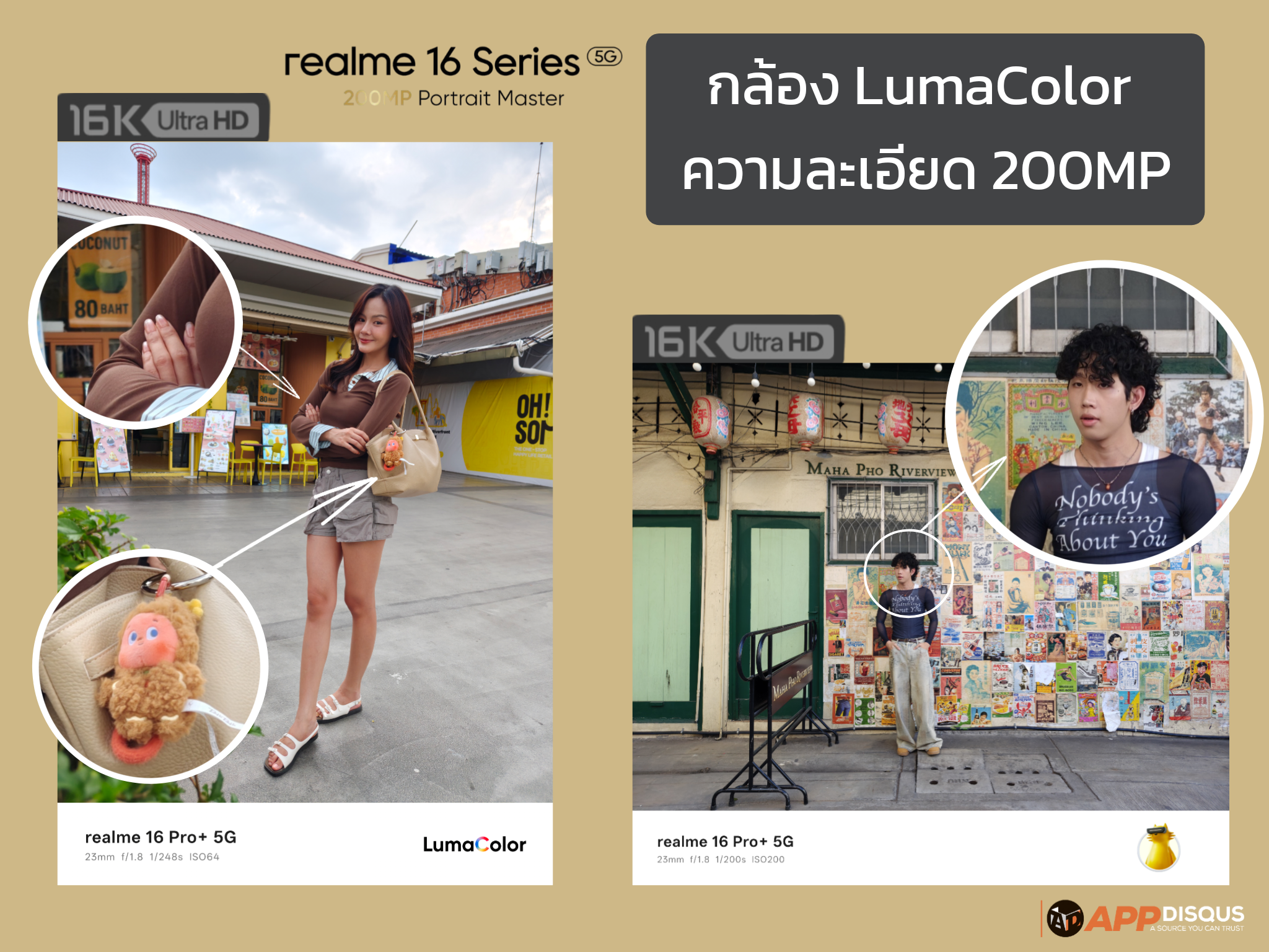 แม้ว่าทั้งสองรุ่นจะใช้กล้องหลัก 200MP เหมือนกัน แต่ realme 16 Pro+ ถูกออกแบบให้เป็นรุ่นที่มีความสามารถด้านการถ่ายภาพครบกว่า โดยเพิ่มเลนส์ Telephoto สำหรับพอร์ตเทรตระยะ 3.5× เข้ามา ทำให้สามารถถ่ายภาพบุคคลแบบซูมด้วยระยะออปติคัลได้โดยไม่สูญเสียรายละเอียด ขณะที่ realme 16 Pro จะใช้การซูมผ่านระบบ Full-pixel Auto Zoom ของกล้องหลักแทน ทำให้ยังสามารถซูมและครอปภาพได้โดยคงรายละเอียดระดับสูงจากเซนเซอร์ 200MP