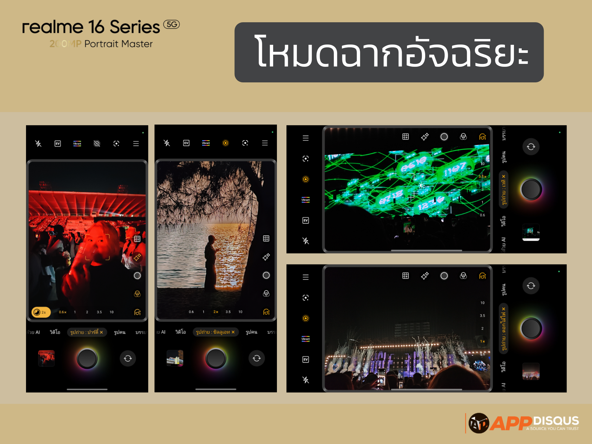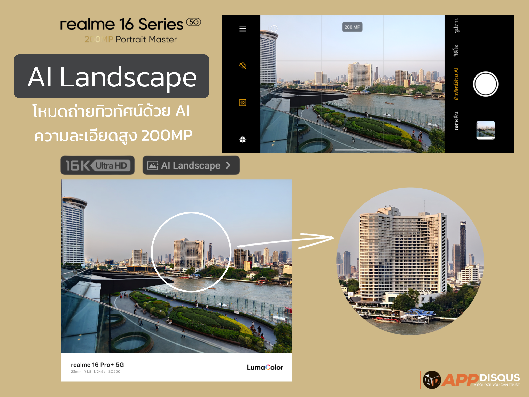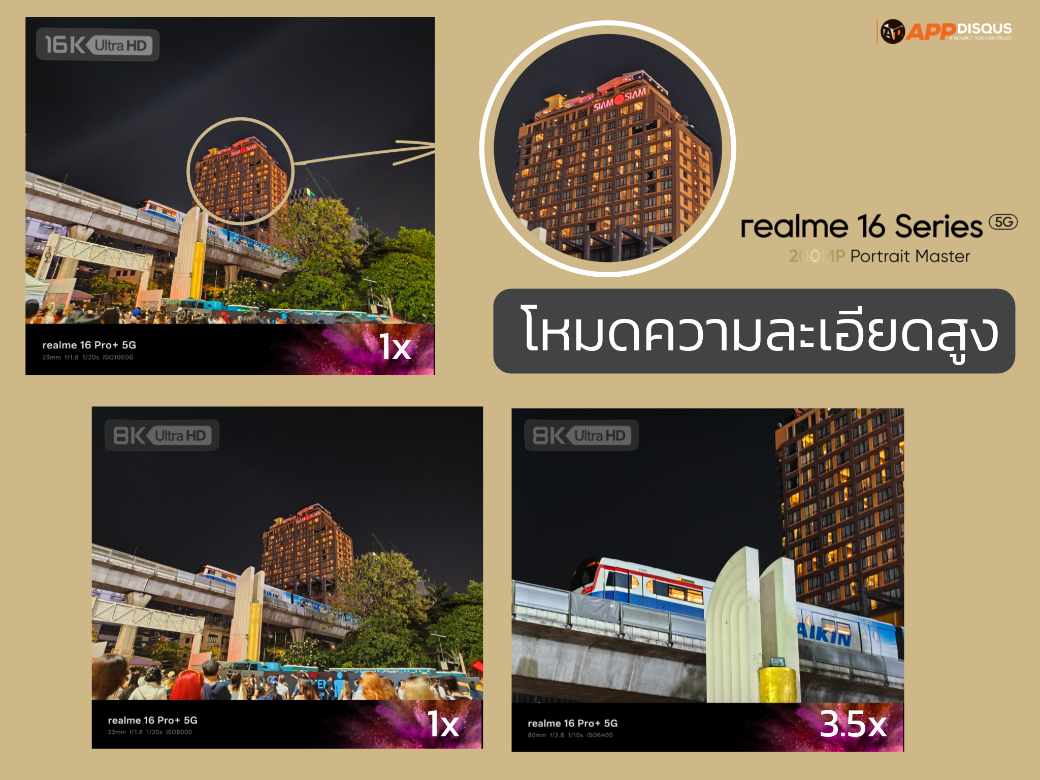 realme 16 Pro Series ใช้กล้องหลักความละเอียดสูงถึง 200 ล้านพิกเซล (200MP LumaColor Camera) ทั้งสองรุ่น ในโหมดนี้ช่วยให้การถ่ายภาพวิว ภาพสถาปัตยกรรม หรือภาพบุคคล สามารถนำมาซูมดูรายละเอียดในภาพภายหลัง ก็ยังคงความคมชัดไว้ได้ดีครับ