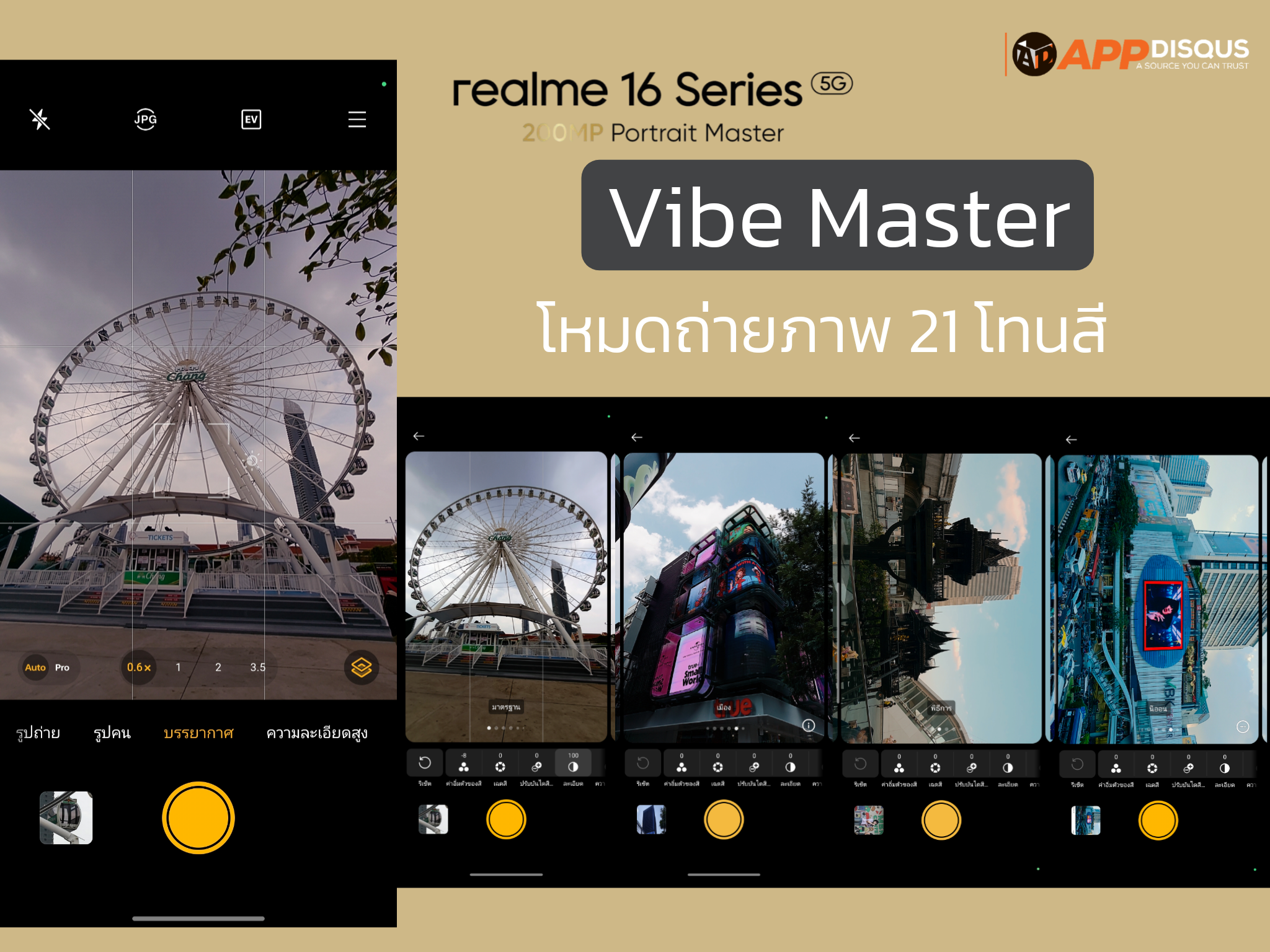 อีกหนึ่งฟีเจอร์ที่ช่วยเพิ่มความสนุกให้กับการถ่ายภาพใน realme 16 Pro Series คือ Vibe Master Mode ซึ่งเป็นโหมดถ่ายภาพที่ออกแบบมาเพื่อช่วยสร้างบรรยากาศและสไตล์ของภาพได้ง่ายขึ้นโดยไม่ต้องปรับแต่งเองมากนัก มีมาให้ใช้มากถึง 21 โทนสี