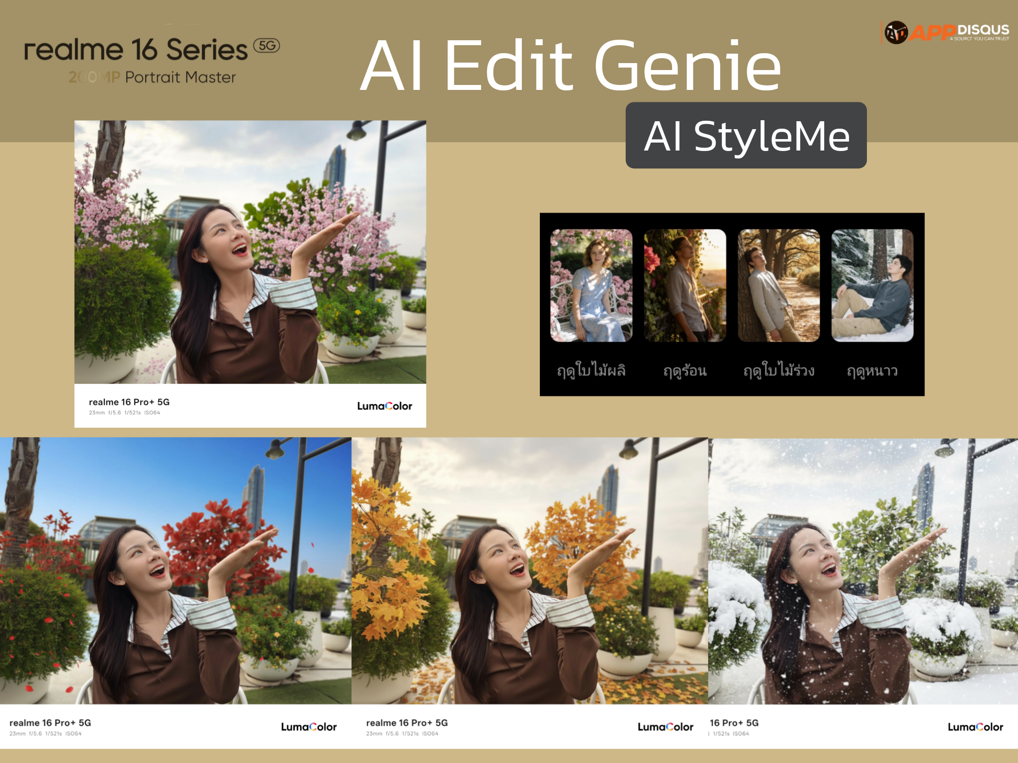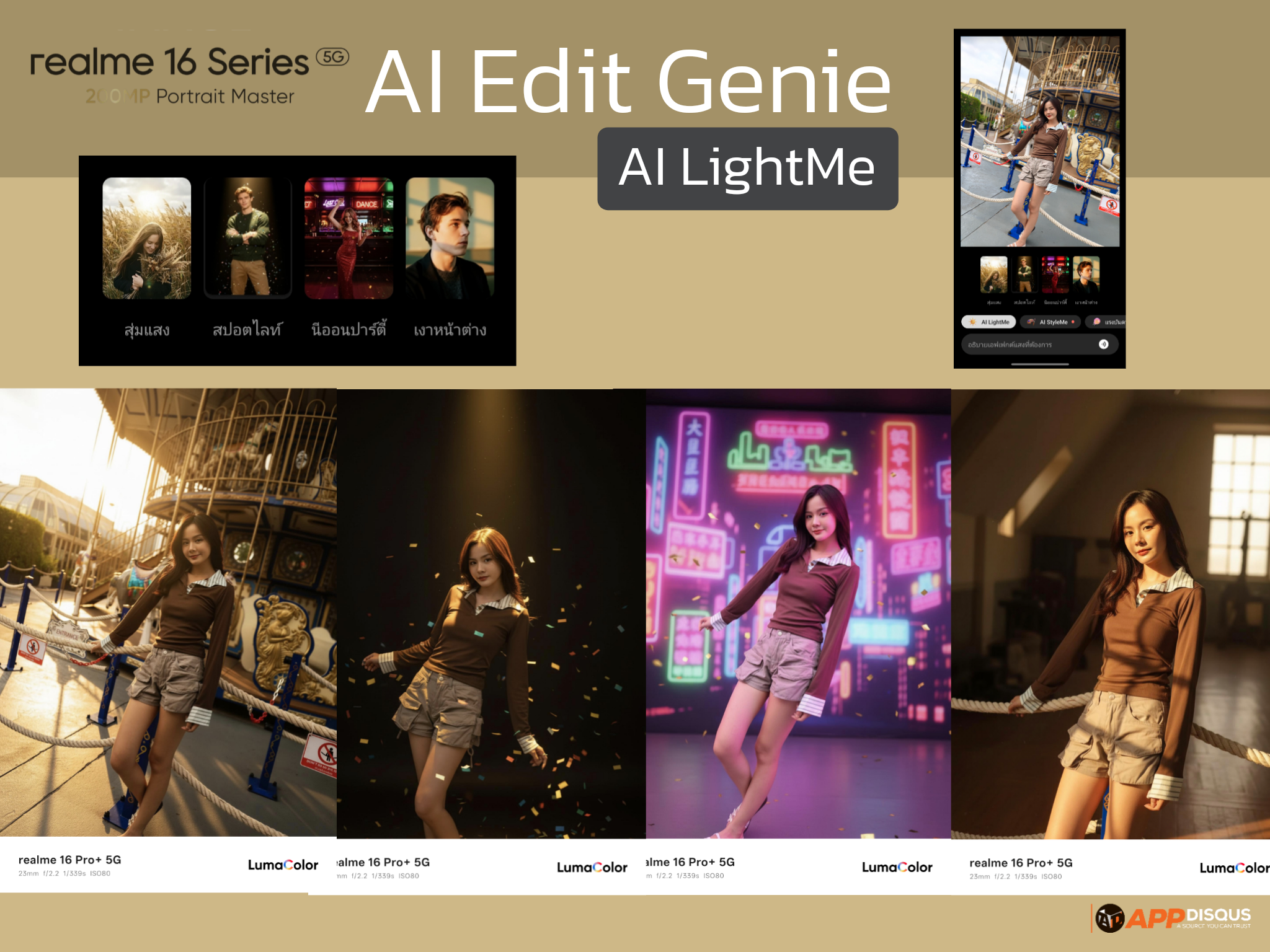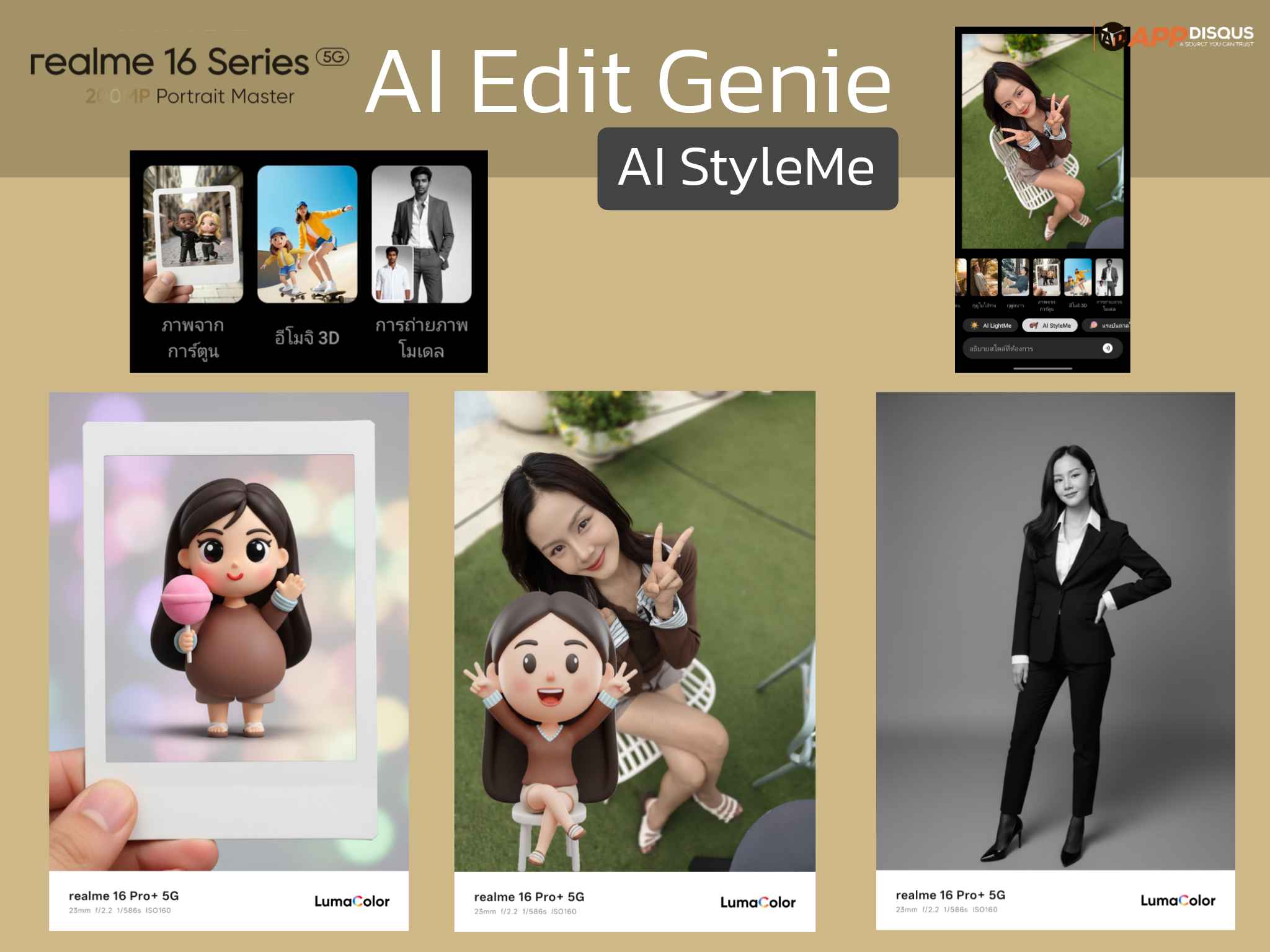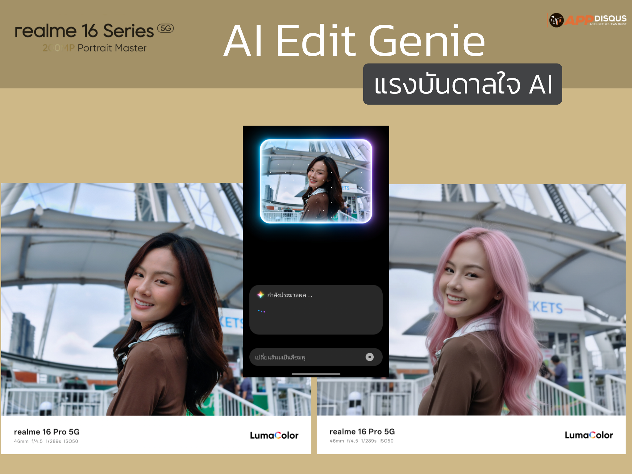 อีกหนึ่งความสามารถด้านการแต่งภาพของ realme 16 Pro Series คือระบบ AI Edit Genie ที่ถูกออกแบบมาเพื่อให้ผู้ใช้สามารถแก้ไขภาพได้ง่ายขึ้นด้วยคำสั่งเพียงไม่กี่ขั้นตอน แนวคิดของฟีเจอร์นี้คือการนำเทคโนโลยี AI โมเดล nano banana เข้ามาช่วยวิเคราะห์ภาพและปรับแต่งรายละเอียดต่าง ๆ ให้โดยอัตโนมัติ ทำให้การแก้ไขภาพที่ซับซ้อนสามารถทำได้ภายในตัวเครื่องโดยไม่ต้องใช้แอปเพิ่มเติม