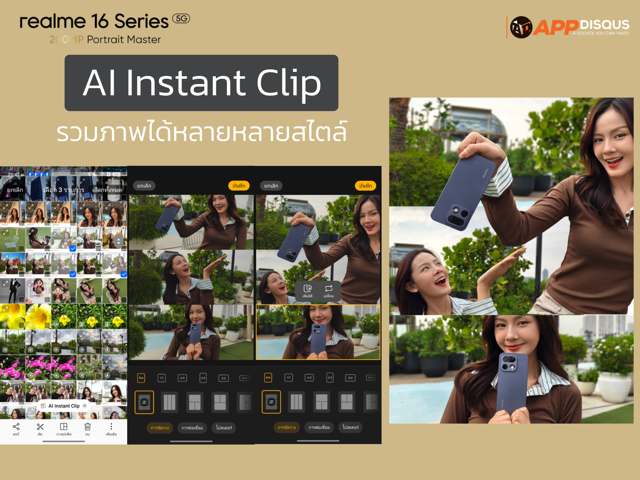 realme 16 Pro Series ยังมีฟีเจอร์ AI Instant Clip ที่ช่วยให้ผู้ใช้สามารถสร้างวิดีโอสั้นได้อย่างรวดเร็วจากคลิปที่ถ่ายไว้ในเครื่อง ระบบจะเลือกช่วงสำคัญของวิดีโอและตัดต่อให้อัตโนมัติ พร้อมใส่เพลงและเอฟเฟกต์ให้เสร็จในขั้นตอนเดียว ทำให้สามารถนำวิดีโอไปแชร์ต่อได้ทันที