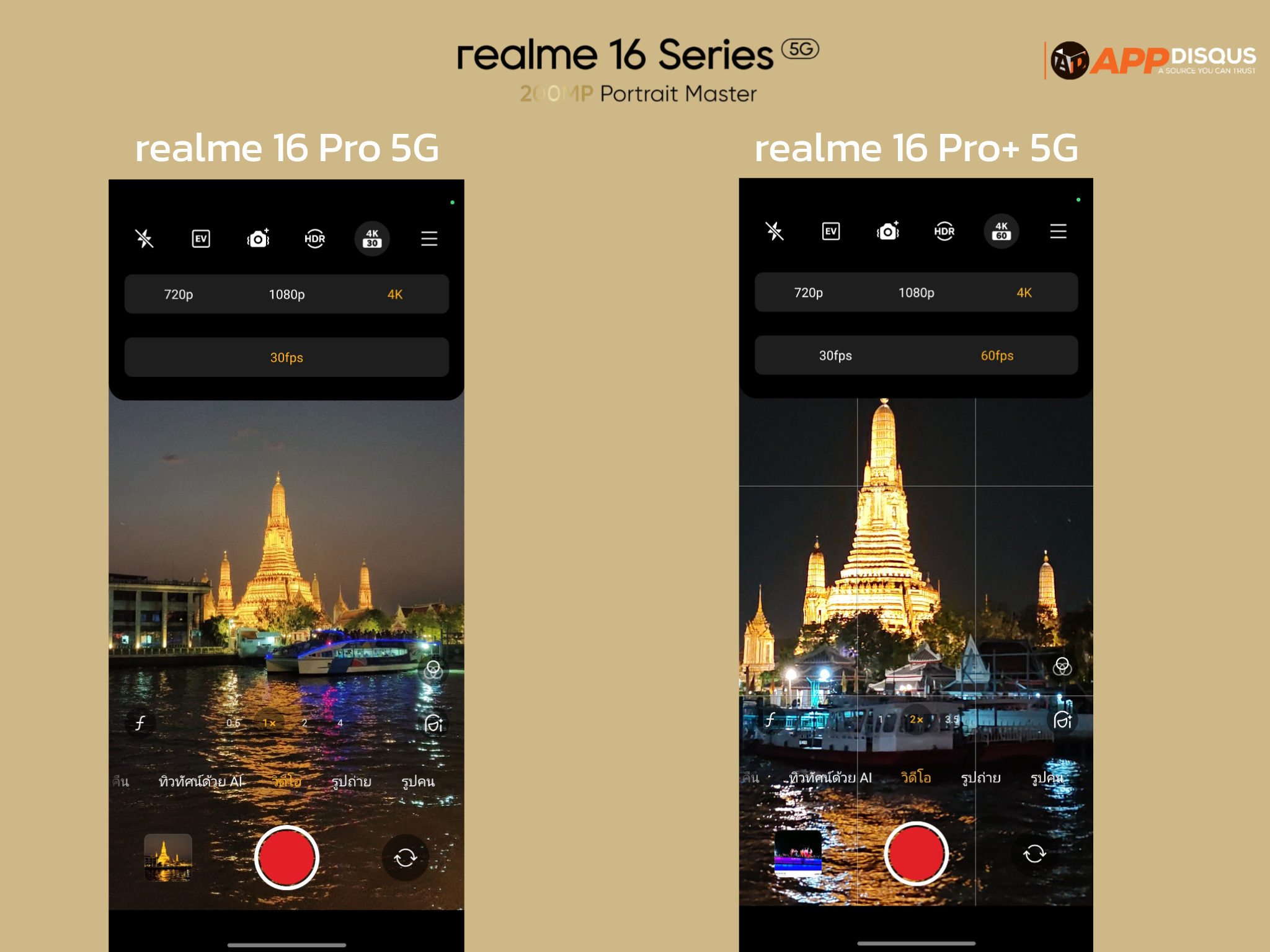 ในด้านการถ่ายวิดีโอ realme 16 Pro 5G จะรองรับการถ่ายวิดีโอสูงสุด 4K 30fps ส่วน realme 16 Pro+ 5G จะรองรับการถ่ายวิดีโอสูงสุด 4K 60fps