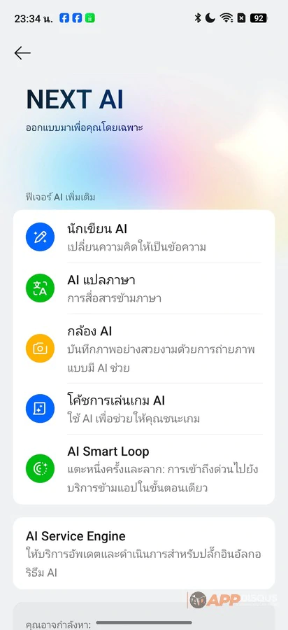 อีกหนึ่งองค์ประกอบสำคัญของระบบคือแพลตฟอร์ม NEXT AI ซึ่งรวมฟีเจอร์ AI หลายด้านเข้ามาไว้ โดยมีการทำงานหลักๆ ใช้งานได้จริงบนตัวเครื่อง เช่น