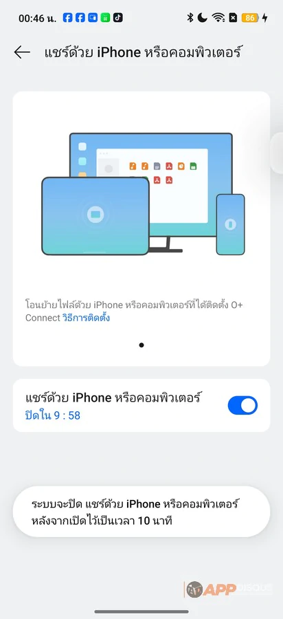 นอกจากนี้ยังมีฟีเจอร์เชื่อมต่อข้ามอุปกรณ์อย่าง 0+ Connect ที่สามารถแชร์ไฟล์ระหว่างสมาร์ตโฟน iPhone และคอมพิวเตอร์ได้อย่างสะดวก แชร์ไฟล์หรือใช้งานกันข้ามอุปกรณ์ได้ง่าย