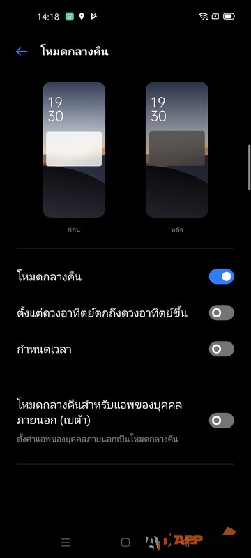 ตัว realme UI มีการใส่ฟังก์ชั่นใหม่ๆ ที่น่าสนใจมาหลายตัวครับ เช่นโหมดกลางคืน หรือจะเรียกว่าโหมดมืดก็ได้ครับ การปรับหน้าตาการใช้งานและเมนูต่างๆ ให้เป็นโทนสีดำทั้งหมด ซึ่งในโหมดกลางคืนของ realme UI จะเป็นการปรับหน้าตาของแอพพลิเคชั่นจากผู้พัฒนาภายนอกได้ด้วยครับ