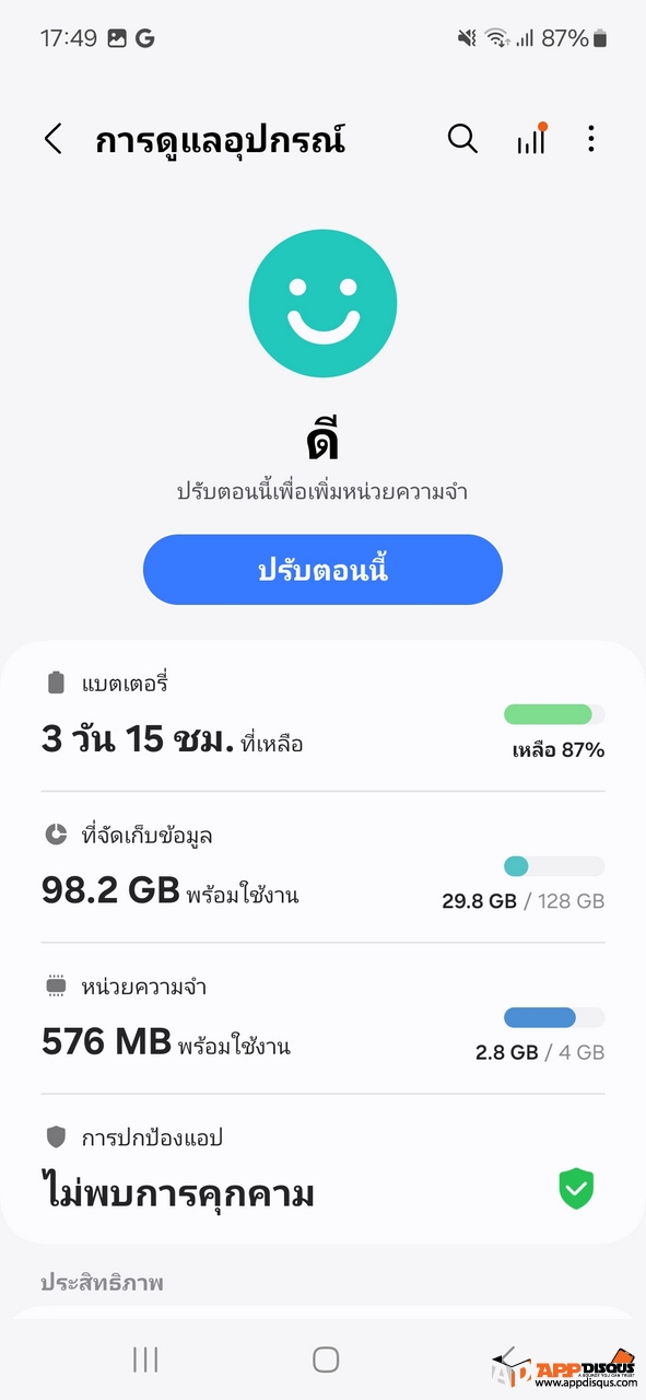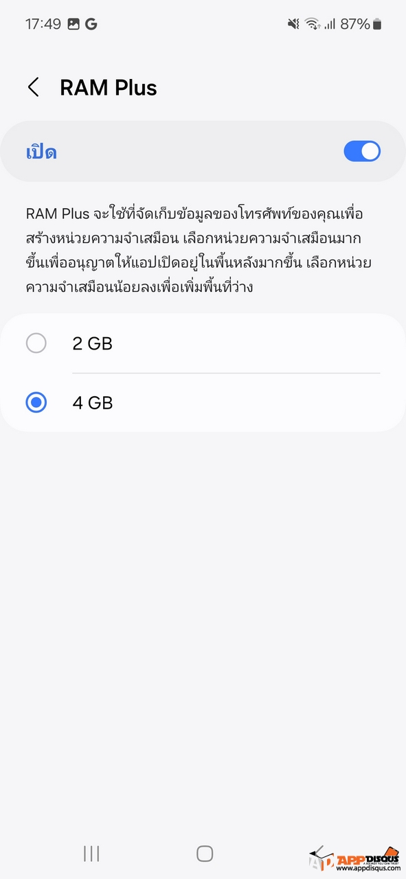 มีความสามารถของ RAM Plus ที่จะสามารถขยาย RAM ออกไปได้อีกจากพื้นที่หน่วยความจำที่ยังไม่ได้ใช้งาน โดยในรุ่น RAM 4GB เราสามารถขยายออกไปได้สูงสุด 4GB โดยสามารถเข้าไปปรับระดับของ RAM Plus ได้ในการตั้งค่าหัวข้อ “การดูแลอุปกรณ์” และกดที่แท็บ “หน่วยความจำ” เลื่อนลงมาด้านล่างเพื่อเปิดใช้งานและปรับระดับขนาดของ RAM Plus