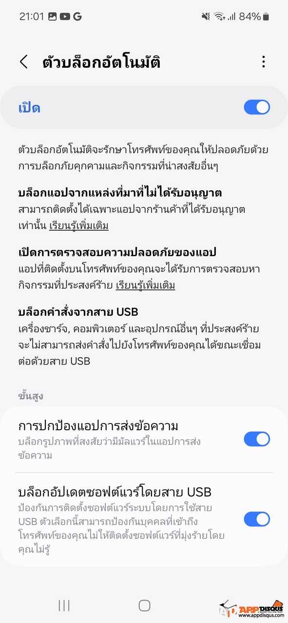 ระบบ OneUI 6.1 ที่ใส่อยู่ใน Galaxy A16 5G ทำให้ผู้ใช้ได้รับความสามารถของ “Auto Blocker” หรือ “ตัวบล็อกอัตโนมัติ” เข้ามาใช้งานด้วย เป็นระบบที่จะทำการบล็อกสิ่งที่ดูอันตรายจากช่องทางต่างๆ ที่เราอาจจะไม่รู้หรือเผลอมองข้ามไป เช่น การติดตั้งแอปจากแหล่งที่ไม่น่าเชื่อถือ, ตรวจสอบการกระทำของแอปที่อาจจะเป็นอันตราย, ลิงก์หลอกลวงให้ติดตั้งแอปดูดเงินจาก SMS, หรือการไปเผลอเสียบสาย USB ที่มีการดักใส่คำสั่งแฝงเข้ามาในเครื่องของเรา โดยฟังก์ชั่นพิเศษพวกนี้จะสามารถบล็อกเอาไว้ได้ครับ และเราสามารถใช้งานได้ฟรี โดยเข้าไปเปิดในการตั้งค่าตัวเครื่อง เมนู “ความปลอดภัยและความเป็นส่วนตัว” แนะนำว่าควรเปิดไว้ครับ ทั้งสำหรับตัวเราเองหรือการมอบเครื่องให้เด็กและผู้ใหญ่ภายในบ้านใช้งาน