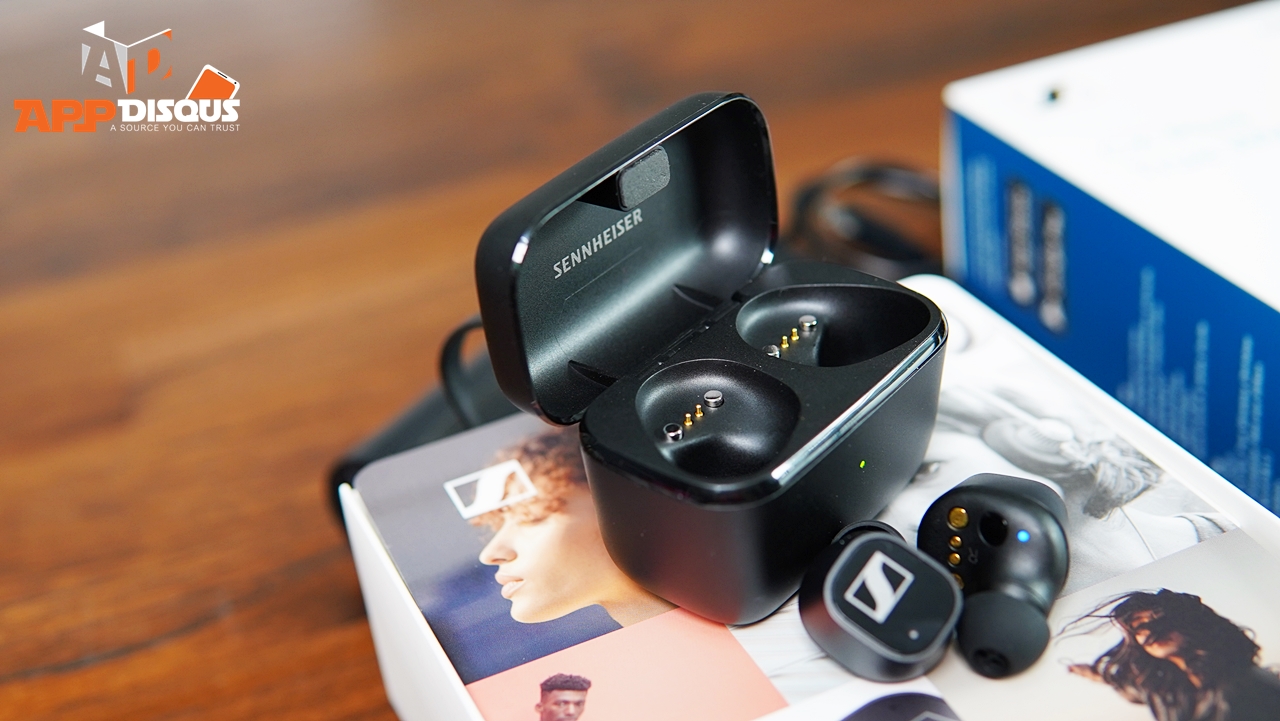 ด้านบนฝาเคสฝังโลโก้เซนไฮเซอร์โลหะสีเงิน ด้านในบุยางกันกระแทกบริเวณฝาปิด ด้านในฝาเคสสกรีนชื่อ Sennheiser น้ำหนักของตัวเคสชาร์จรวมหูฟังเบามาก หนักเพียง 47 กรัม ตัวเคสหนัก 35 กรัม ตัวหูฟังหนักเพียงข้างละ 6 กรัม ด้านในมีแม่เหล็กดูดตัวหัวฟังไม่ให้หลุดง่าย